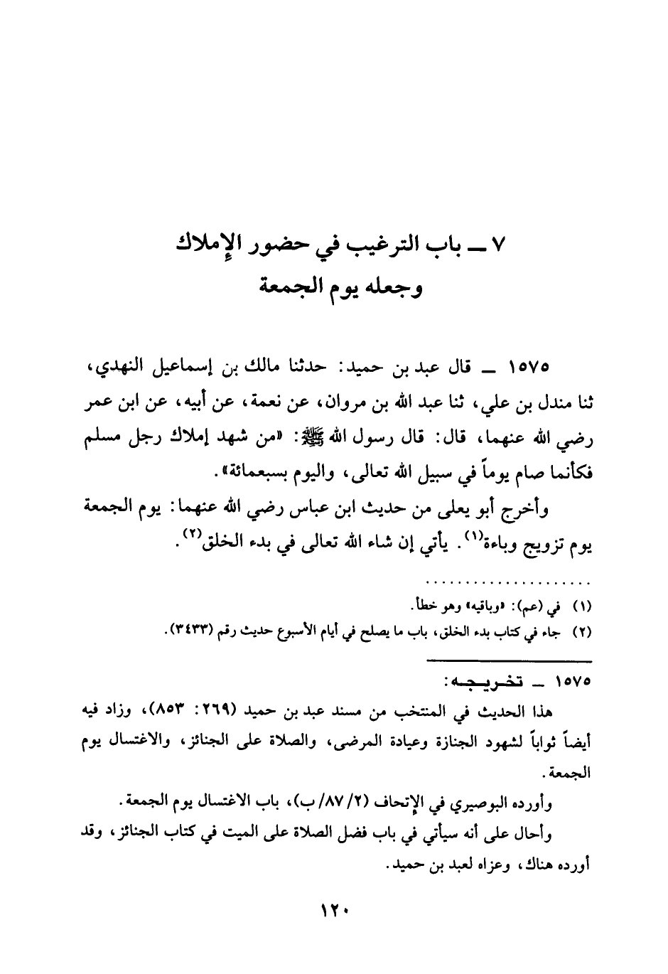 1575 - قَالَ عَبْدُ بْنُ حُمَيْدٍ حدثنا مَالِكُ بْنُ أسماعي النَّهْدِيُّ ثنا مِنْدَلُ بْنُ عَلِيٍّ ثنا عَبْدُ اللَّهِ بْنُ مَرْوَانَ عَنْ نِعْمَةَ عَنْ أَبِيهِ عَنِ ابن عمر رَضِيَ الله عَنْهما قَالَ قَالَ رَسُولُ اللَّهِ صَلَّى اللَّهُ عَلَيْهِ وَسَلَّمَ §مَنْ شَهِدَ إِمْلَاكَ رَجُلٍ مُسْلِمٍ فَكَأَنَّمَا صَامَ يَوْمًا فِي سبيل الله تعالى واليوم بسبعمائة