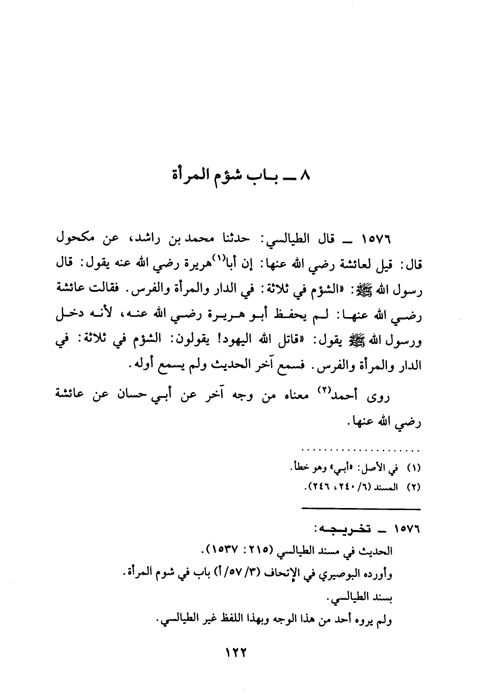 1576 - قَالَ الطَّيَالِسِيُّ حَدَّثَنَا مُحَمَّدُ بْنُ رَاشِدٍ عَنْ مَكْحُولٍ قَالَ قيل لعائشة رَضِيَ الله عَنْها إِنَّ أبا هريرة رَضِيَ الله عَنْه يَقُولُ قَالَ رَسُولُ اللَّهِ صَلَّى اللَّهُ عَلَيْهِ وَسَلَّمَ الشُّؤْمُ فِي ثَلَاثَةٍ فِي الدَّارِ وَالْمَرْأَةِ وَالْفَرَسِ فقالت عائشة رَضِيَ الله عَنْها لَمْ يَحْفَظْ أبو هريرة رَضِيَ الله عَنْه لِأَنَّهُ دَخَلَ وَرَسُولُ اللَّهِ صَلَّى اللَّهُ عَلَيْهِ وَسَلَّمَ يَقُولُ §قَاتَلَ اللَّهُ الْيَهُودَ يَقُولُونَ الشُّؤْمُ فِي ثَلَاثَةٍ فِي الدَّارِ وَالْمَرْأَةِ وَالْفَرَسِ فَسَمِعَ آخِرَ الْحَدِيثِ وَلَمْ يَسْمَعْ أَوَّلَهُ