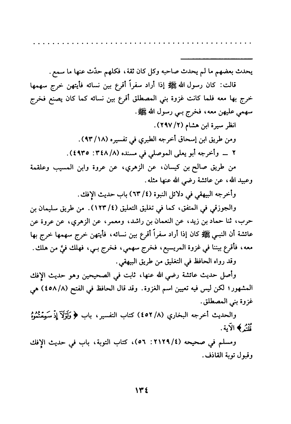 والجوزقي في المتفق، كما في تغليق العليق (4/ 123). من طريق سُلَيْمَانَ بْنُ حَرْبٍ، ثنا حَمَّادُ بْنُ زَيْدٍ، عن النعمان بن راشد، ومعمر، عَنِ الزُّهْرِيِّ، عَنْ عُرْوَةَ عَنْ عَائِشَةَ أَنَّ النَّبِيَّ -صَلَّى اللَّهُ عَلَيْهِ وَسَلَّمَ- كَانَ إِذَا أراد سفرًا أقرع بين نسائه، فأيتهن خرج سهمها خرج بها معه، فأقرع بيننا في غزوة المريسيع، فخرج سهمي، فخرج بي، فهلك فيَّ من هلك.