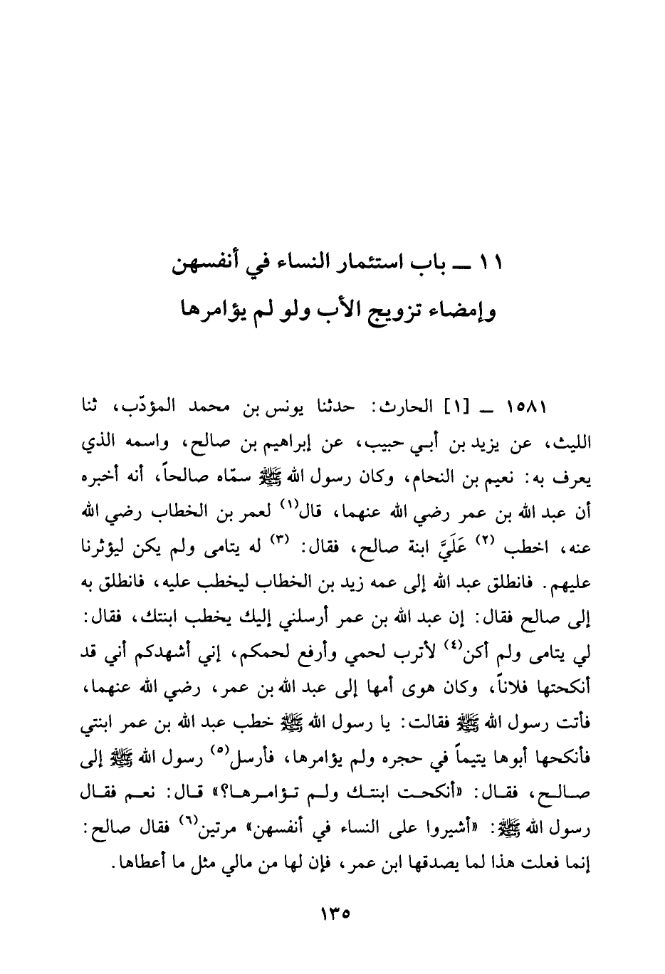 1581 - الْحَارِثُ حَدَّثَنَا يُونُسُ بْنُ مُحَمَّدٍ الْمُؤَدِّبُ ثنا اللَّيْثُ عَنْ يَزِيدَ بْنِ أَبِي حَبِيبٍ عَنْ إِبْرَاهِيمَ بْنِ صَالِحٍ وَاسْمُهُ الَّذِي يُعْرَفُ بِهِ نُعَيْمُ بْنُ النَّحَّامِ وَكَانَ رَسُولُ اللَّهِ صَلَّى اللَّهُ عَلَيْهِ وَسَلَّمَ سَمَّاهُ صَالِحًا أَنَّهُ أَخْبَرَهُ أَنَّ عَبْدَ اللَّهِ بن عمر رَضِيَ الله عَنْهما قَالَ لِعُمَرَ بن الخطاب رَضِيَ الله عَنْه اخْطُبْ عَلَيَّ ابْنَةَ صَالِحٍ فَقَالَ لَهُ يَتَامَى وَلَمْ يَكُنْ لؤثرنا عَلَيْهِمْ فَانْطَلَقَ عَبْدُ اللَّهِ إِلَى عَمِّهِ زَيْدِ بْنِ الْخَطَّابِ لِيَخْطُبَ عَلَيْهِ فَانْطَلَقَ بِهِ إِلَى صَالِحٍ فَقَالَ إِنَّ عَبْدَ اللَّهِ بْنَ عمر أرسلني إليك يَخْطُبُ ابْنَتَكَ فَقَالَ لِي يَتَامَى وَلَمْ أَكُنْ لِأُتْرِبَ لَحْمِي وَأَرْفَعَ لَحْمَكُمْ إِنِّي أُشْهِدُكُمْ أَنِّي قَدْ أَنْكَحْتُهَا فُلَانًا وَكَانَ هَوَى أُمِّهَا إِلَى عَبْدِ اللَّهِ بن عمر رَضِيَ الله عَنْهما فَأَتَتْ رَسُولَ اللَّهِ صَلَّى اللَّهُ عَلَيْهِ وَسَلَّمَ فَقَالَتْ يَا رَسُولَ اللَّهِ صَلَّى اللَّهُ عَلَيْهِ وَسَلَّمَ خَطَبَ عبد الله ين عُمَرَ ابْنَتِي فَأَنْكَحَهَا أَبُوهَا يَتِيمًا فِي حِجْرِهِ وَلَمْ يؤمرها فَأَرْسَلَ رَسُولُ اللَّهِ صَلَّى اللَّهُ عَلَيْهِ وَسَلَّمَ إِلَى صَالِحٍ فَقَالَ أَنْكَحْتَ ابنيك وَلَمْ تؤمرها قَالَ نَعَمْ فَقَالَ رَسُولُ اللَّهِ صَلَّى اللَّهُ عَلَيْهِ وَسَلَّمَ §أَشِيرُوا عَلَى النِّسَاءِ فِي أَنْفُسِهِنِّ مَرَّتَيْنِ فَقَالَ صَالِحٌ إِنَّمَا فَعَلْتُ هَذَا لِمَا يُصْدِقُهَا ابْنُ عُمَرَ فَإِنَّ لَهَا مِنْ مَالِي مِثْلَ مَا أَعْطَاهَا