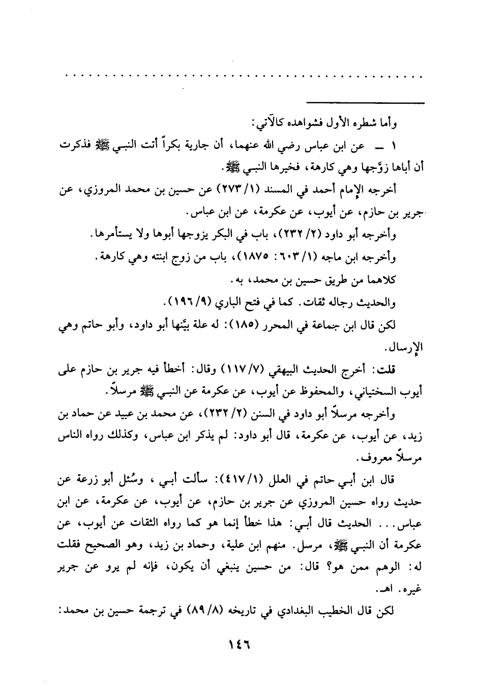قلت: أخرج الحديث البيهقي (7/ 117) وقال: أخطأ فيه جرير بن حازم على أيوب السختياني، والمحفوظ عن أيوب، عن عكرمة عن النبي -صلي الله عليه وسلم- مرسلًا.