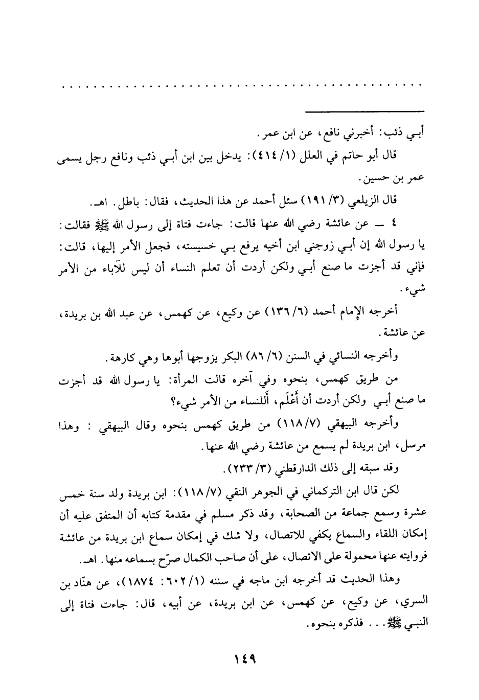 لكن قال ابن التركماني في الجوهر النقي (7/ 118): ابن بريدة ولد سنة خمس عشرة وسمع جماعة من الصحابة، وقد ذكر مسلم في مقدمة كتابه أن المتفق عليه أن إمكان اللقاء والسماع يكفي للاتصال، ولا شك في إمكان سماع ابن بريدة من عائشة فروايته عنها محمولة على الاتصال، على أن صاحب الكمال صرّح بسماعه منها. اهـ.