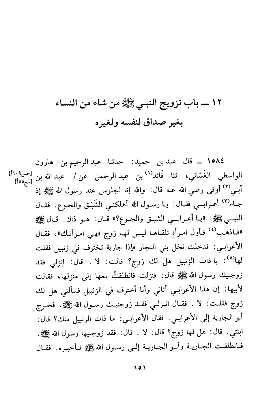 1584 - قال عبد ين حُمَيْدٍ حدثنا عَبْدُ الرَّحِيمِ بْنُ هَارُونَ الْوَاسِطِيُّ الْغَسَّانِيُّ ثنا فَائِدُ بْنُ عَبْدِ الرَّحْمَنِ عَنْ عَبْدِ اللَّهِ بْنِ أبي أوفى رَضِيَ الله عَنْه قَالَ وَاللَّهِ إِنَّا لَجُلُوسٌ عِنْدَ رَسُولِ الله صَلَّى اللَّهُ عَلَيْهِ وَسَلَّمَ إذ جاء أَعْرَابِيٌّ فَقَالَ يَا رَسُولَ اللَّهِ أَهْلَكَنِيَ الشَّبَقُ والجوع فقال النبي صَلَّى اللَّهُ عَلَيْهِ وَسَلَّمَ يَا أَعْرَابِيُّ الشَّبَقُ وَالْجُوعُ قَالَ هُوَ ذَاكَ قَالَ صَلَّى اللَّهُ عَلَيْهِ وَسَلَّمَ §فَاذْهَبْ فَأَوَّلُ امْرَأَةٍ تَلْقَاهَا لَيْسَ لَهَا زَوْجٌ فهي امرأتك فقال الْأَعْرَابِيُّ فَدَخَلْتُ نَخْلَ بَنِي النَّجَّارِ فَإِذَا جَارِيَةٌ تَخْتَرِفُ في زَنْبِيلٍ، فَقُلْتُ لَهَا: يَا ذَاتَ الزِّنْبِيلِ، هَلْ لَكِ زَوْجٌ؟ قَالَتْ: لَا، قَالَ: انْزِلِي، فَقَدْ زَوَّجَنِيكِ رَسُولُ اللَّهِ صَلَّى اللَّهُ عَلَيْهِ وَسَلَّمَ قَالَ فَنَزَلَتْ فَانْطَلَقْتُ مَعَهَا إِلَى مَنْزِلِهَا فَقَالَتْ لِأَبِيهَا إِنَّ هَذَا الْأَعْرَابِيَّ أتاني وَأَنَا أَخْتَرِفُ فِي الزِّنْبِيلِ فَسَأَلَنِي هَلْ لَكِ زَوْجٌ فَقُلْتُ لَا فَقَالَ انْزِلِي فَقَدْ زَوَّجَنِيكِ رَسُولُ اللَّهِ صَلَّى اللَّهُ عَلَيْهِ وَسَلَّمَ فَخَرَجَ أَبُو الْجَارِيَةِ إِلَى الْأَعْرَابِيِّ فَقَالَ الْأَعْرَابِيُّ مَا ذَاتُ الزِّنْبِيلِ مِنْكَ قَالَ ابْنَتِي قَالَ هَلْ لَهَا زَوْجٌ قَالَ لَا قَالَ فَقَدْ زَوَّجَنِيهَا رَسُولُ اللَّهِ صَلَّى اللَّهُ عَلَيْهِ وَسَلَّمَ فانطلقت الجارية وأبو الْجَارِيَةُ إِلَى رَسُولِ اللَّهِ صَلَّى اللَّهُ عَلَيْهِ وَسَلَّمَ فَأَخْبَرَهُ فَقَالَ -[152]- رَسُولُ اللَّهِ صَلَّى اللَّهُ عَلَيْهِ وَسَلَّمَ هَلْ لَهَا زوج قال لا قال صَلَّى اللَّهُ عَلَيْهِ وَسَلَّمَ لذهب فَأَحْسِنْ جِهَازَهَا ثُمَّ ابعث بها غليه فَانْطَلَقَ أَبُو الْجَارِيَةِ فَجَهَّزَ ابْنَتَهُ وَأَحْسَنَ الْقِيَامَ عَلَيْهَا ثُمَّ بَعَثَ مَعَهَا بِتَمْرٍ وَلَبَنٍ فَجَاءَتْ بِهِ إِلَى بَيْتِ الْأَعْرَابِيِّ وانصر الْأَعْرَابِيُّ إِلَى بَيْتِهِ فَرَأَى جَارِيَةً مُصَنَّعَةً ورأى تمرا ولينا فَقَامَ إِلَى الصَّلَاةِ فَلَمَّا طَلَعَ الْفَجْرُ غَدَا إِلَى رَسُولِ اللَّهِ وَغَدَا أَبُو الْجَارِيَةِ عَلَى ابْنَتِهِ فَقَالَتْ وَاللَّهِ مَا قَرُبَنَا وَلَا قَرُبَ تَمْرَنَا ولا لبننا قال فَانْطَلَقَ أَبُو الْجَارِيَةِ إِلَى رَسُولِ الله صَلَّى اللَّهُ عَلَيْهِ وَسَلَّمَ فاخبره فدعى الْأَعْرَابِيَّ فَقَالَ يَا أَعْرَابِيُّ مَا مَنَعَكَ أَنْ تَكُونَ ألمت بِأَهْلِكَ قَالَ يَا رَسُولَ اللَّهِ انْصَرَفْتُ مِنْ عِنْدِكَ وَدَخَلْتُ الْمَنْزِلَ وَإِذَا تجارية مُصَنَّعَةٍ وَرَأَيْتُ تَمْرًا وَلَبَنًا فَكَانَ يَجِبُ عَلَيَّ أَنْ أُحْيِيَ لَيْلَتِي إِلَى الصُّبْحِ يَعْنِي شُكْرًا فَقَالَ صَلَّى اللَّهُ عَلَيْهِ وَسَلَّمَ يَا أَعْرَابِيُّ اذْهَبْ فألم بِأَهْلِكَ