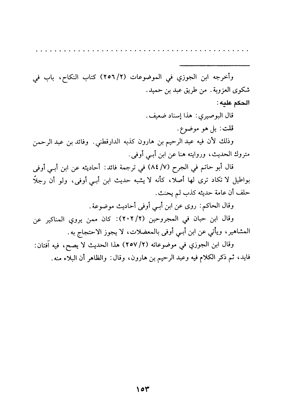 وقال ابن حبان في المجروحين (2/ 202): كان ممن يروي المناكير عن المشاهير، ويأتي عن ابن أبي أوفى بالمعضلات، لا يجوز الاحتجاج به.