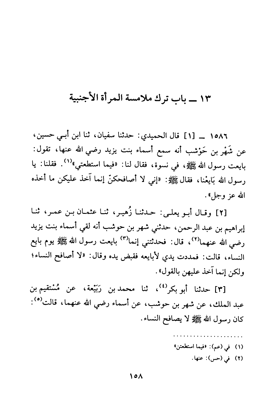 1586 - قَالَ الْحُمَيْدِيُّ حَدَّثَنَا سُفْيَانُ ثنا ابْنُ أَبِي حُسَيْنٍ عَنْ شهر بن حوسب أَنَّهُ سَمِعَ أَسْمَاءَ بنت يزيد رَضِيَ الله عَنْها تقول بايعت رَسُولَ اللَّهِ فِي نِسْوَةٍ فَقَالَ لَنَا فِيمَا استطعتي فَقُلْنَا يَا رَسُولَ اللَّهِ بَايِعْنَا فَقَالَ صَلَّى اللَّهُ عَلَيْهِ وَسَلَّمَ إِنِّي لَا أُصَافِحُكُنَّ إِنَّمَا §آخُذُ علكن ما أخذه اللَّهُ عَزَّ وَجَلَّ