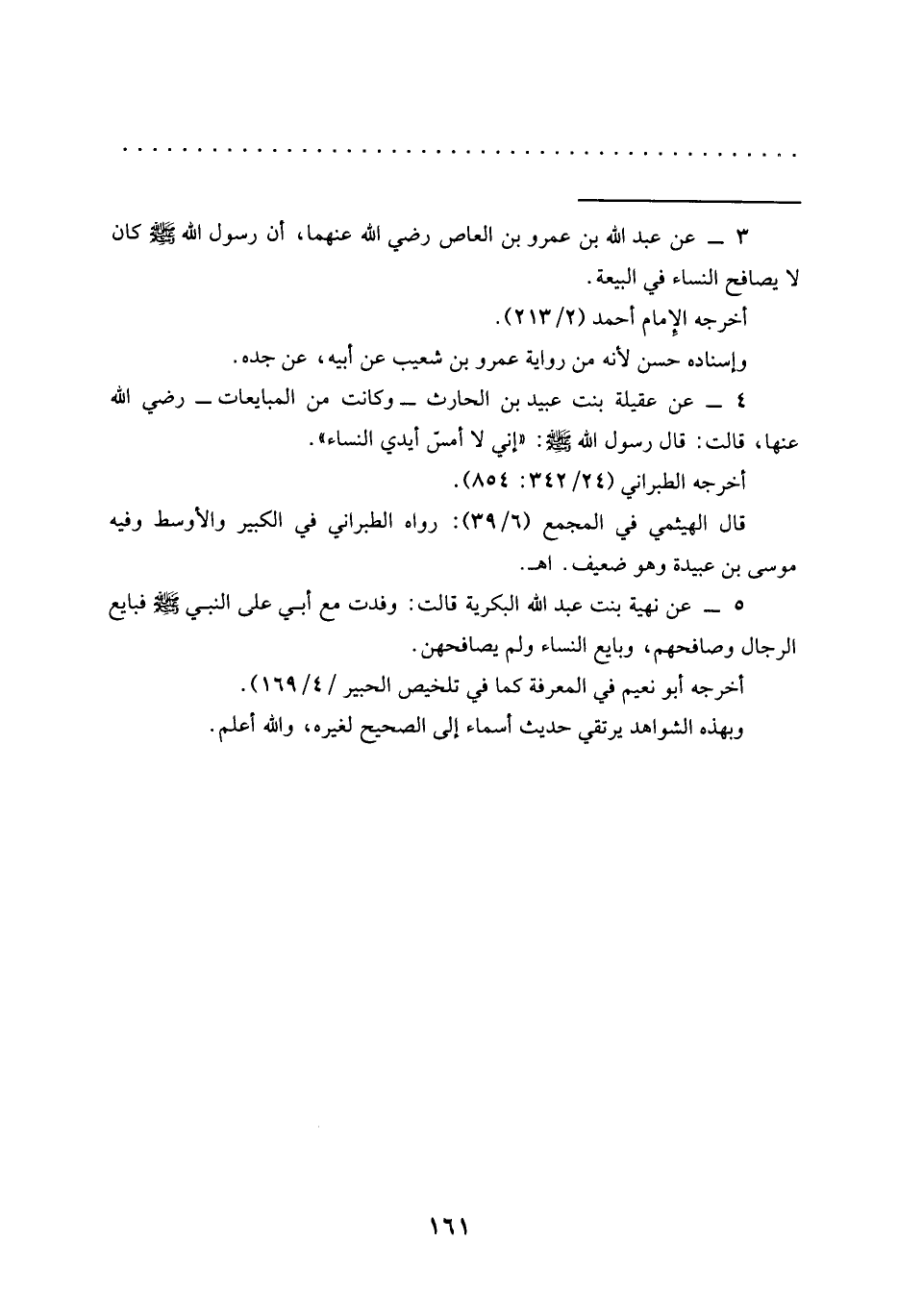 5 - عن نهية بنت عبد الله البكرية قالت: وفدت مع أبي على النبي -صلى الله عليه وسلم- فبايع الرجال وصافحهم، وبايع النساء ولم يصافحهن.