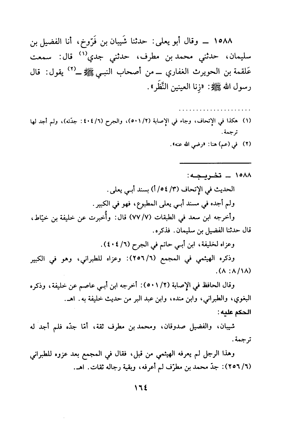 1588 - وقال أَبُو يَعْلَى حَدَّثَنَا شَيْبَانُ بْنُ فَرُّوخَ أنا الْفُضَيْلُ بْنُ سُلَيْمَانَ حَدَّثَنِي مُحَمَّدُ بْنُ مُطَرِّفٍ حدثني جدي قال سَمِعْتُ عَلْقَمَةَ بْنَ الحويرت الْغِفَارِيَّ مِنْ أصحاب النبي صَلَّى اللَّهُ عَلَيْهِ وَسَلَّمَ يَقُولُ قَالَ رَسُولُ اللَّهِ صَلَّى اللَّهُ عَلَيْهِ وَسَلَّمَ §زِنَا الْعَيْنَيْنِ النَّظَرُ