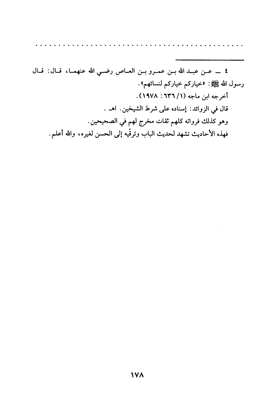 = 4 - عَنْ عَبْدِ اللَّهِ بْنِ عَمْرِو بْنِ الْعَاصِ رضي الله عنهما، قَالَ: قَالَ رَسُولُ اللَّهِ -صَلَّى اللَّهُ عَلَيْهِ وسلم-: "خياركم خياركم لنسائهم".