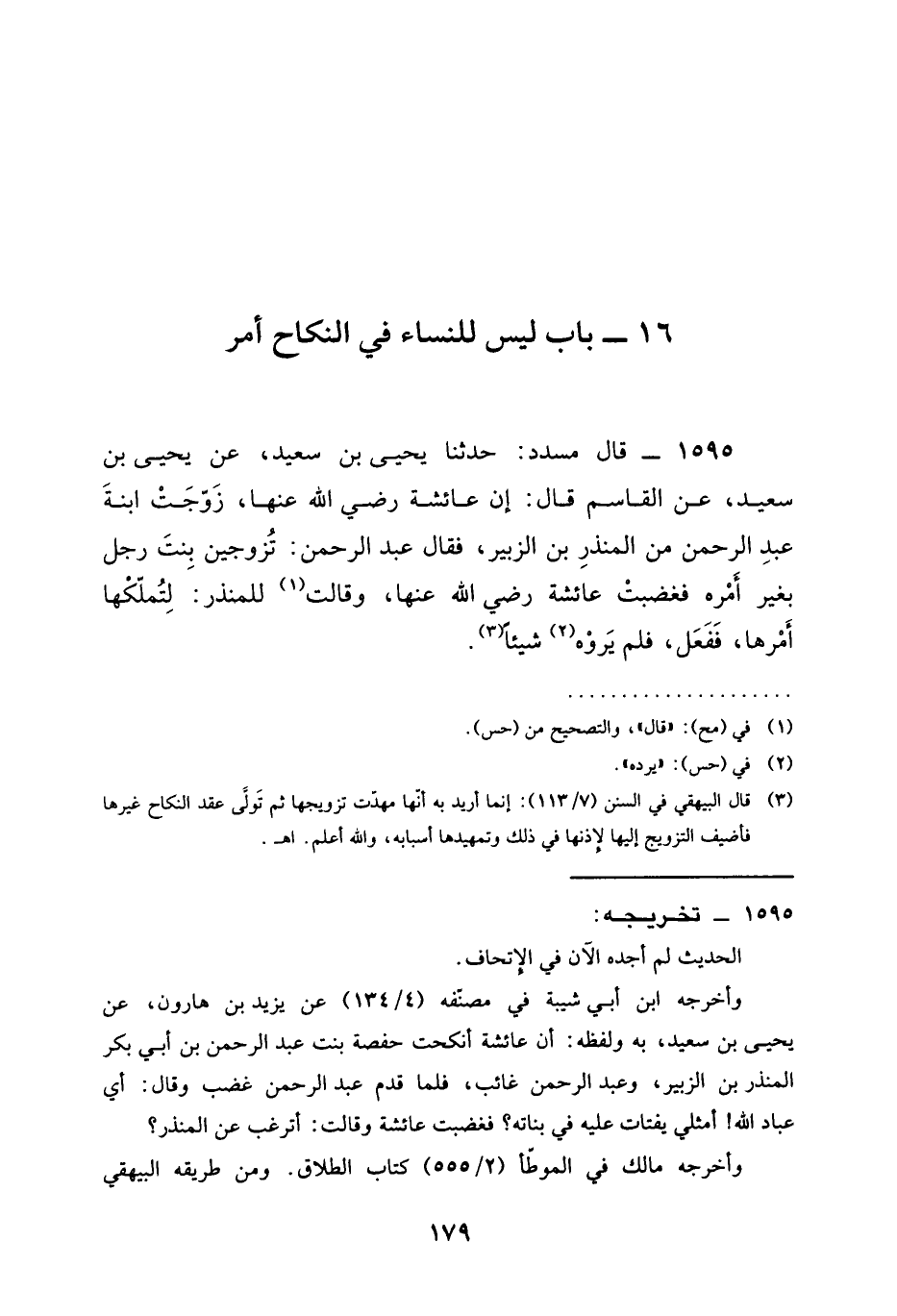 1595 - قَالَ مُسَدَّدٌ حَدَّثَنَا يَحْيَى بْنُ سَعِيدٍ عَنْ يَحْيَى بْنِ سَعِيدٍ عن القاسم قال إن عائشة رَضِيَ الله عَنْها زَوَّجَتِ ابْنَةَ عَبْدِ الرَّحْمَنِ مِنَ الْمُنْذِرِ بْنِ الزيبر فَقَالَ عَبْدُ الرحمن §تزوجين بنت رَجُلٍ بِغَيْرِ أَمْرِهِ فغضبت عائشة رَضِيَ الله عَنْها وَقَالَتْ لِلْمُنْذِرِ لتملكها أَمْرَهَا فَفَعَلَ فَلَمْ يَرَوْهُ شَيْئًا