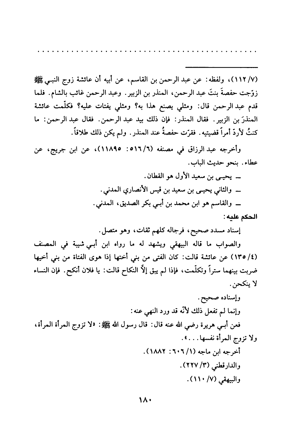 = (7/ 112)، ولفظه: عن عبد الرحمن بن القاسم، عن أبيه أن عَائِشَةَ زَوْجِ النَّبِيِّ -صَلَّى اللَّهُ عَلَيْهِ وَسَلَّمَ- زوّجت حفصةَ بنتَ عبد الرحمن، المنذر بن الزبير. وعبد الرحمن غائب بالشام. فلما قدم عبد الرحمن قال: ومثلي يصنع هذا به؟ ومثلي يفتات عليه؟ فكلّمت عائشة المنذرَ بن الزبير. فقال المنذر: فإن ذلك بيد عبد الرحمن. فقال عبد الرحمن: ما كنتُ لأردّ أمرًا قضيتيه. فقرّت حفصةُ عند المنذر. ولم يكن ذلك طلاقًا.