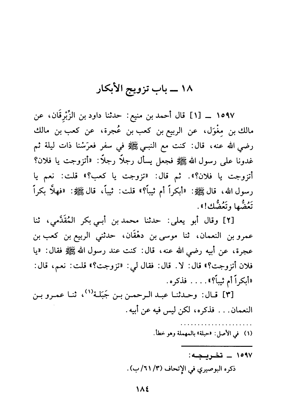 1597 - قَالَ أَحْمَدُ بْنُ مَنِيعٍ حَدَّثَنَا دَاوُدُ بْنُ الزِّبْرِقَانِ عَنْ مَالِكِ بْنِ مِغْوَلٍ عَنِ الرَّبِيعِ بْنِ كَعْبِ بْنِ عُجْرَةَ عَنْ كَعْبِ بن مالك رَضِيَ الله عَنْه قال كنت مع النبي صَلَّى اللَّهُ عَلَيْهِ وَسَلَّمَ فِي سَفَرٍ فَعَرَّسْنَا ذَاتَ لَيْلَةٍ ثُمَّ غَدَوْنَا عَلَى رَسُولِ اللَّهِ صَلَّى اللَّهُ عَلَيْهِ وَسَلَّمَ فَجَعَلَ يَسْأَلُ رَجُلًا رَجُلًا أَتَزَوَّجْتَ يَا فُلَانُ أَتَزَوَّجْتَ يَا فُلَانُ ثُمَّ قَالَ تزوجت يَا كَعْبُ قُلْتُ نَعَمْ يَا رَسُولَ اللَّهِ قَالَ صَلَّى اللَّهُ عَلَيْهِ وَسَلَّمَ أَبِكْرًا أَمْ ثَيِّبًا قُلْتُ ثَيِّبًا قَالَ صَلَّى اللَّهُ عَلَيْهِ وَسَلَّمَ §فَهَلَّا بِكْرًا تَعَضُّهَا وتضعك