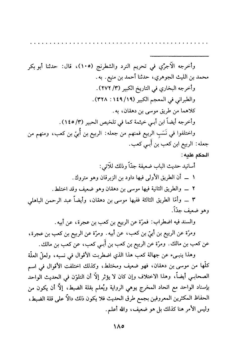 وهذا ينبىء عن جهالة كعب هذا الذي اضطربت الأقوال في نسبه، ولعلّ العلّة كلّها من موسى بن دهقان، فهو ضعيف ومختلط، وكذلك اختلفت الأقوال في اسم الصحابي أيضًا، وهذا الاختلاف وإن كان لا يؤثر إلَّا أن التلوّن في الحديث الواحد بإسناد الواحد مع اتحاد المخرج يوهي الرواية ويُعلم بقلة الضبط، إلَّا أن يكون من الحفاظ المكثرين المعروفين بجمع طرق الحديث فلا يكون ذلك دالًا على قلة الضبط، وليس الأمر هنا كذلك بل هو ضعيف، والله أعلم. =