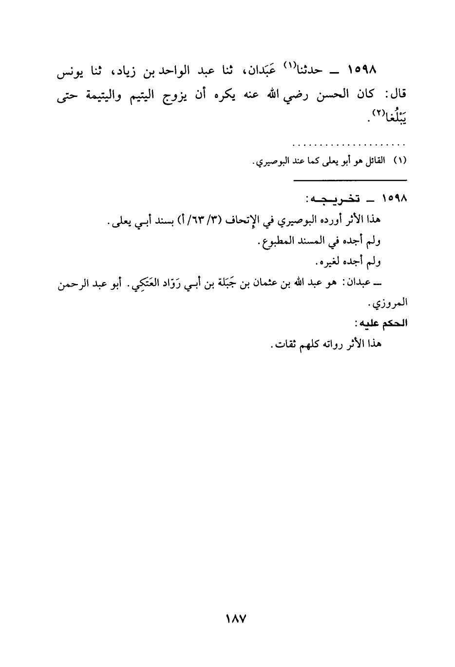 1598 - حَدَّثَنَا عَبْدَانُ ثنا عَبْدُ الْوَاحِدِ بْنُ زِيَادٍ ثنا يُونُسُ قَالَ §كان الحسن رَضِيَ الله عَنْه يَكْرَهُ أَنْ يُزَوِّجَ الْيَتِيمَ وَالْيَتِيمَةَ حَتَّى يَبْلُغَا