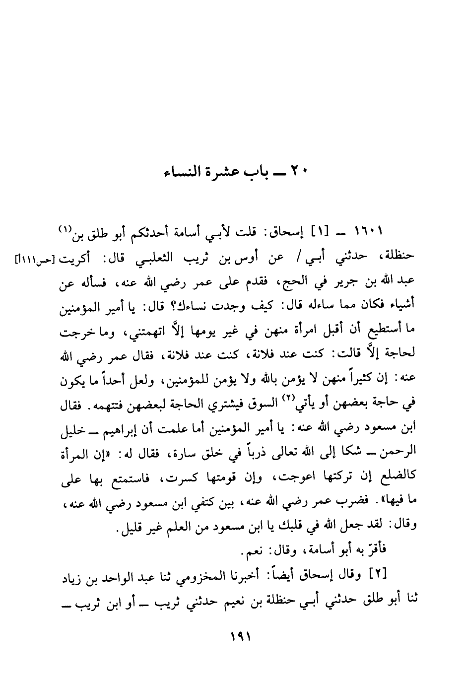 1601 - إِسْحَاقُ قُلْتُ لِأَبِي أُسَامَةَ أَحَدَّثَكُمْ أَبُو طلق بن حَنْظَلَةَ حَدَّثَنِي عَنْ أَوْسِ بْنِ ثُرَيْبٍ الثَّعْلَبِيِّ قَالَ أَكْرَيْتُ عبد الله بن جَرِيرَ فِي الْحَجِّ فَقَدِمَ على عمر رَضِيَ الله عَنْه فسأله عَنْ أَشْيَاءَ فَكَانَ مِمَّا ساءله قَالَ كَيْفَ وَجَدْتَ نِسَاءَكَ قَالَ يَا أَمِيرَ الْمُؤْمِنِينَ مَا أَسْتَطِيعُ أَنْ أُقَبِّلَ امْرَأَةً مِنْهُنَّ فِي غَيْرِ يَوْمِهَا إِلَّا اتَّهَمَتْنِي وَمَا خَرَجْتُ لِحَاجَةٍ إِلَّا قَالَتْ كُنْتَ عِنْدَ فُلَانَةَ كُنْتَ عِنْدَ فُلَانَةَ فَقَالَ عُمَرُ رَضِيَ الله عَنْهُ إِنَّ كَثِيرًا مِنْهُنَّ لَا يُؤْمِنَّ بِاللَّهِ وَلَا يُؤْمِنَّ لِلْمُؤْمِنِينَ وَلَعَلَّ أَحَدًا مَا يَكُونُ فِي حَاجَةِ يعضهن أَوْ يَأْتِي السُّوقَ فَيَشْتَرِي الحاجة لبعضهن فتتهمه فَقَالَ ابن مسعود رَضِيَ الله عَنْه يَا أَمِيرَ الْمُؤْمِنِينَ أَمَا عَلِمْتَ أَنَّ إِبْرَاهِيمَ خليل الرحمن شكا إلى الله تعالى ذَرَبًا فِي خُلُقِ سَارَةَ فَقَالَ لَهُ إِنَّ §الْمَرْأَةَ كَالضِّلْعِ إِنْ تَرَكْتَهَا اعْوَجَّتْ وَإِنْ قومتها كُسِرَتْ فَاسْتَمْتِعْ بِهَا عَلَى مَا فِيهَا فضرب عمر رَضِيَ الله عَنْه بَيْنَ كتفي مسعود رَضِيَ الله عَنْه وَقَالَ لَقَدْ جَعَلَ اللَّهُ فِي قَلْبِكَ يَا ابْنَ مَسْعُودٍ مِنَ الْعِلْمِ غَيْرَ قَلِيلٍ فَأَقَرَّ بِهِ أَبُو أُسَامَةَ وَقَالَ نَعَمْ