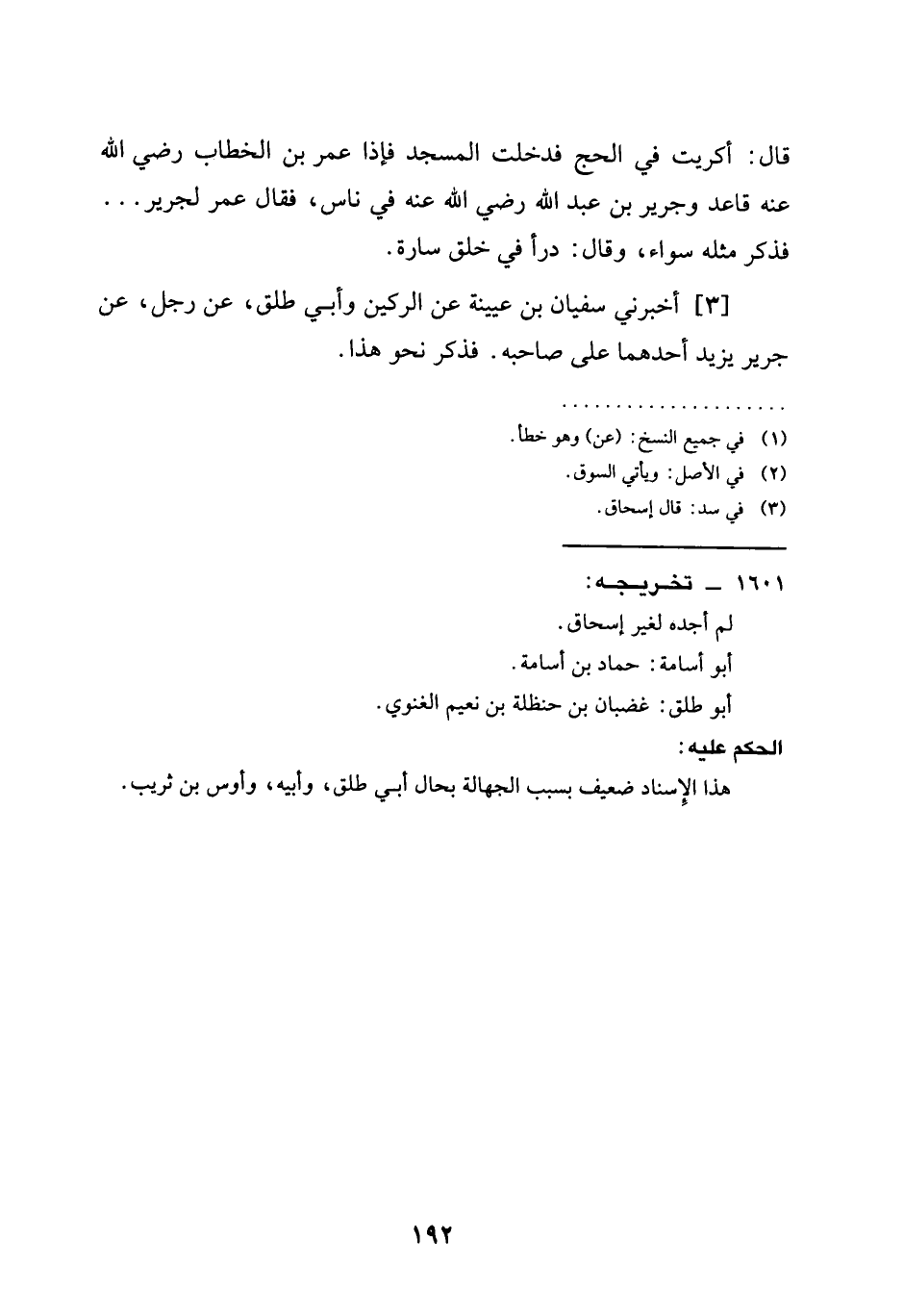 [3] أخبرني سُفْيَانُ بْنُ عُيَيْنَةَ عَنِ الرُّكَيْنِ وَأَبِي طَلْقٍ، عَنْ رَجُلٍ، عَنْ جَرِيرٍ يَزِيدُ أَحَدُهُمَا عَلَى صاحبه. فذكر نحو هذا.
