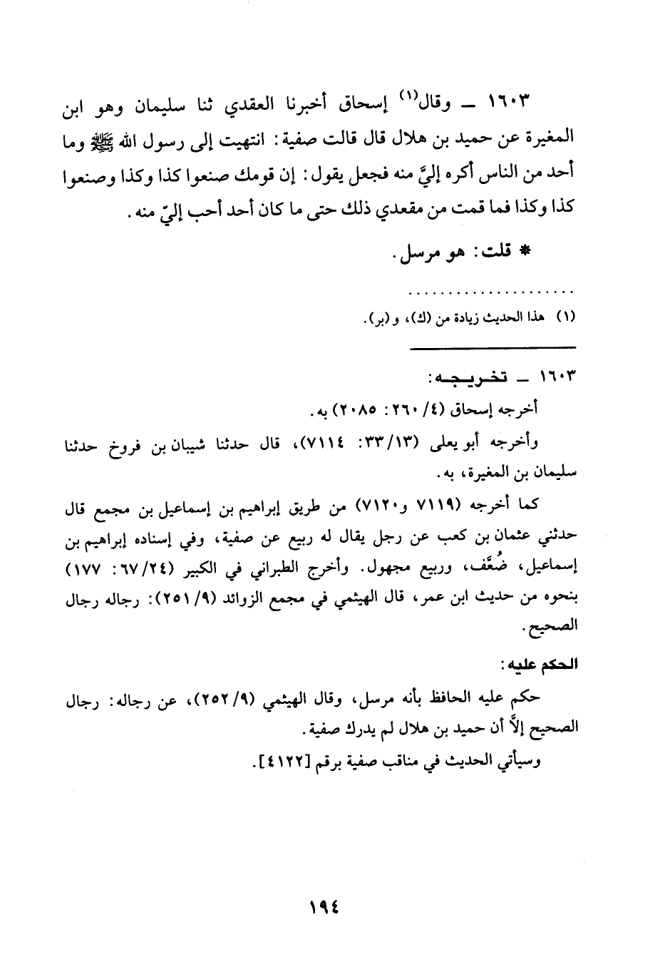 1603 - وقَالَ إِسْحَاقُ أَخْبَرَنَا الْعَقَدِيُّ ثنا سُلَيْمَانُ وَهُوَ ابْنُ الْمُغِيرَةِ عَنْ حُمَيْدِ بْنِ هِلَالٍ قَالَ قَالَتْ صَفِيَّةُ انْتَهَيْتُ إِلَى رَسُولِ اللَّهِ صَلَّى اللَّهُ عَلَيْهِ وَسَلَّمَ وَمَا أَحَدٌ مِنَ النَّاسِ أَكْرَهُ إِلَيَّ مِنْهُ فَجَعَلَ يَقُولُ §إِنَّ قَوْمَكَ صَنَعُوا كَذَا وَكَذَا وَصَنَعُوا كَذَا وَكَذَا فَمَا قُمْتُ مِنْ مَقْعَدِي ذَلِكَ حَتَّى مَا كَانَ أَحَدٌ أَحَبَّ إِلَيَّ مِنْهُ