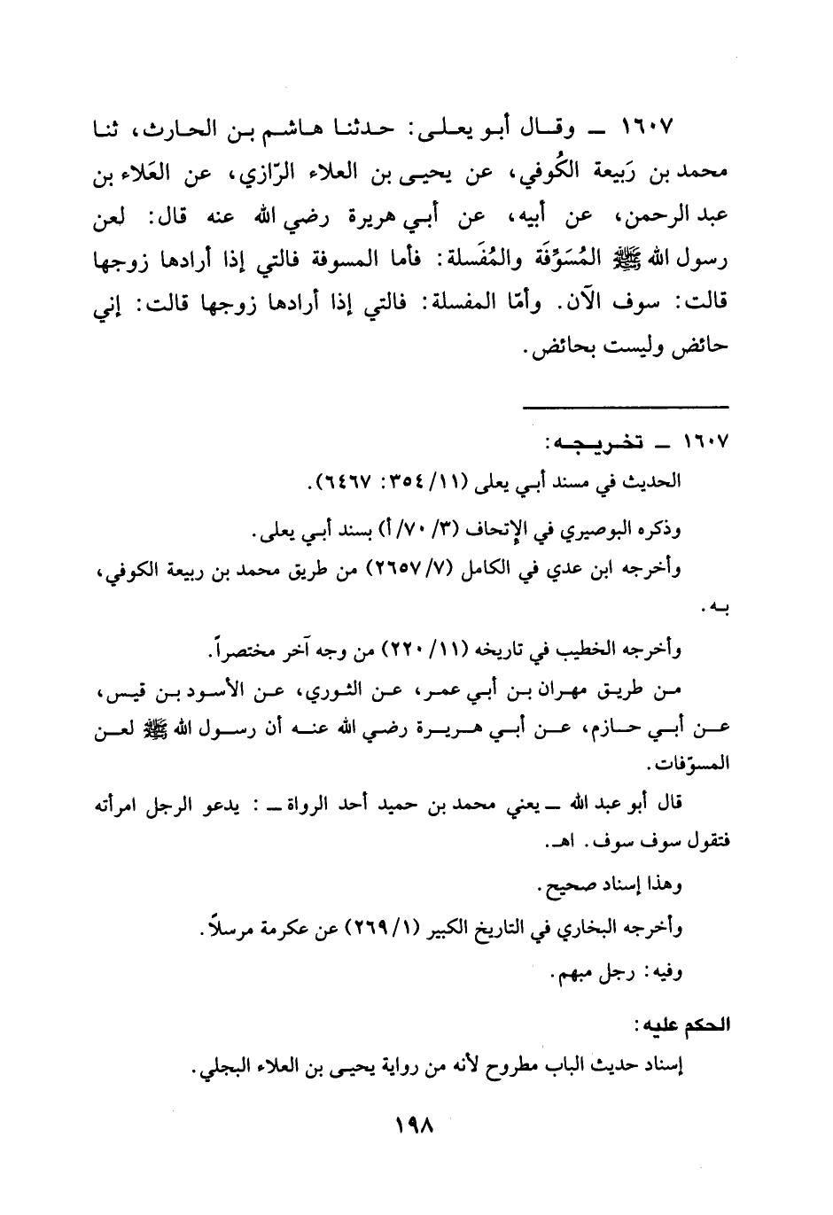 1607 - وَقَالَ أَبُو يَعْلَى حَدَّثَنَا هَاشِمُ بْنُ الْحَارِثِ ثنا مُحَمَّدُ بْنُ رَبِيعَةَ الْكُوفِيُّ عَنْ يَحْيَى بْنِ الْعَلَاءِ الرَّازِيِّ عَنِ الْعَلَاءِ بْنِ عَبْدِ الرَّحْمَنِ عَنْ أَبِيهِ عَنْ أبي هريرة رَضِيَ الله عَنْه قَالَ §لَعَنَ رَسُولُ اللَّهِ صَلَّى اللَّهُ عَلَيْهِ وَسَلَّمَ الْمُسَوِّفَةَ وَالْمُفَسِّلَةَ فَأَمَّا الْمُسَوِّفَةُ فَالَّتِي إِذَا أَرَادَهَا زَوْجُهَا قَالَتْ سَوْفَ الْآنَ وأما المفسلة فالتي إِذَا أَرَادَهَا زَوْجُهَا قَالَتْ إِنِّي حَائِضٌ وَلَيْسَتْ بِحَائِضٍ