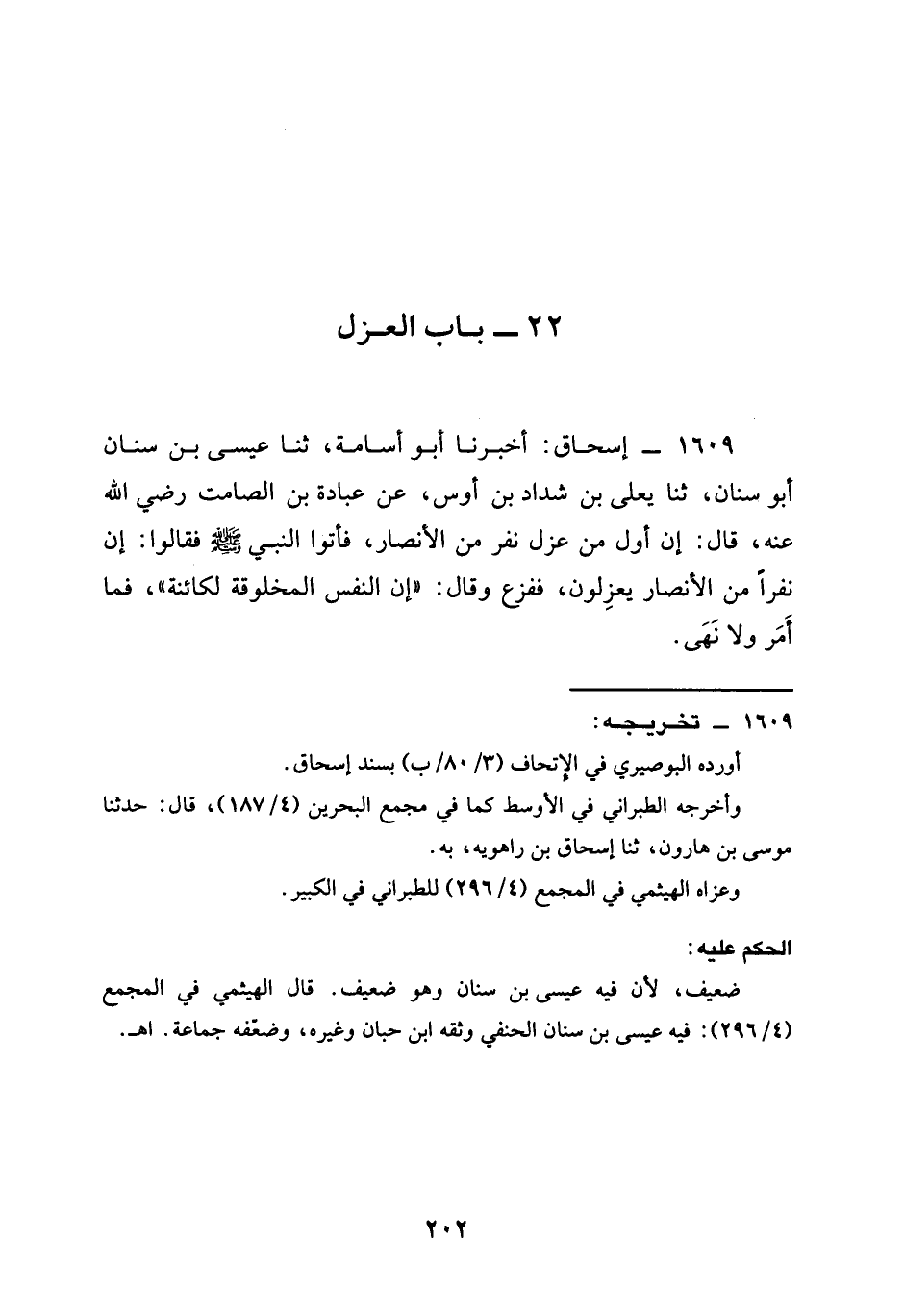 1609 - إِسْحَاقُ أَخْبَرَنَا أَبُو أُسَامَةَ ثنا عيسى ين سِنَانٍ أبو سنان ثنا يَعْلَى بْنِ شَدَّادِ بْنِ أَوْسٍ عَنْ عُبَادَةَ بن الصامت رَضِيَ الله عَنْه قَالَ إِنَّ §أَوَّلَ مَنْ عَزَلَ نَفَرٌ مِنَ الْأَنْصَارِ فَأَتَوَا النَّبِيَّ صَلَّى اللَّهُ عَلَيْهِ وَسَلَّمَ فَقَالُوا إِنَّ نَفَرًا مِنَ الْأَنْصَارِ يَعْزِلُونَ فَفَزِعَ وَقَالَ إِنَّ النَّفْسَ الْمَخْلُوقَةَ لَكَائِنَةٌ فَمَا أَمَرَ وَلَا نَهَى