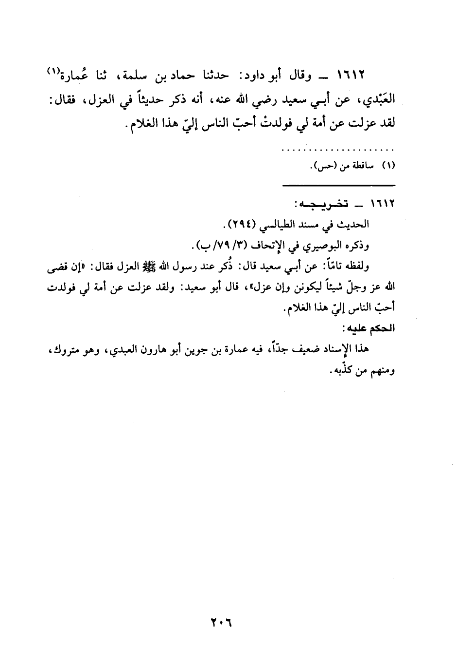 1612 - وَقَالَ أَبُو دَاوُدَ حَدَّثَنَا حَمَّادُ بْنُ سَلَمَةَ ثنا عُمَارَةُ الْعَبْدِيُّ عَنْ أبي سعيد رَضِيَ الله عَنْه أَنَّهُ ذَكَرَ حَدِيثًا فِي الْعَزْلِ فَقَالَ لَقَدْ §عَزَلْتُ عَنْ أَمَةٍ لِي فَوَلَدَتْ أَحَبَّ النَّاسِ إِلَيَّ هَذَا الْغُلَامَ