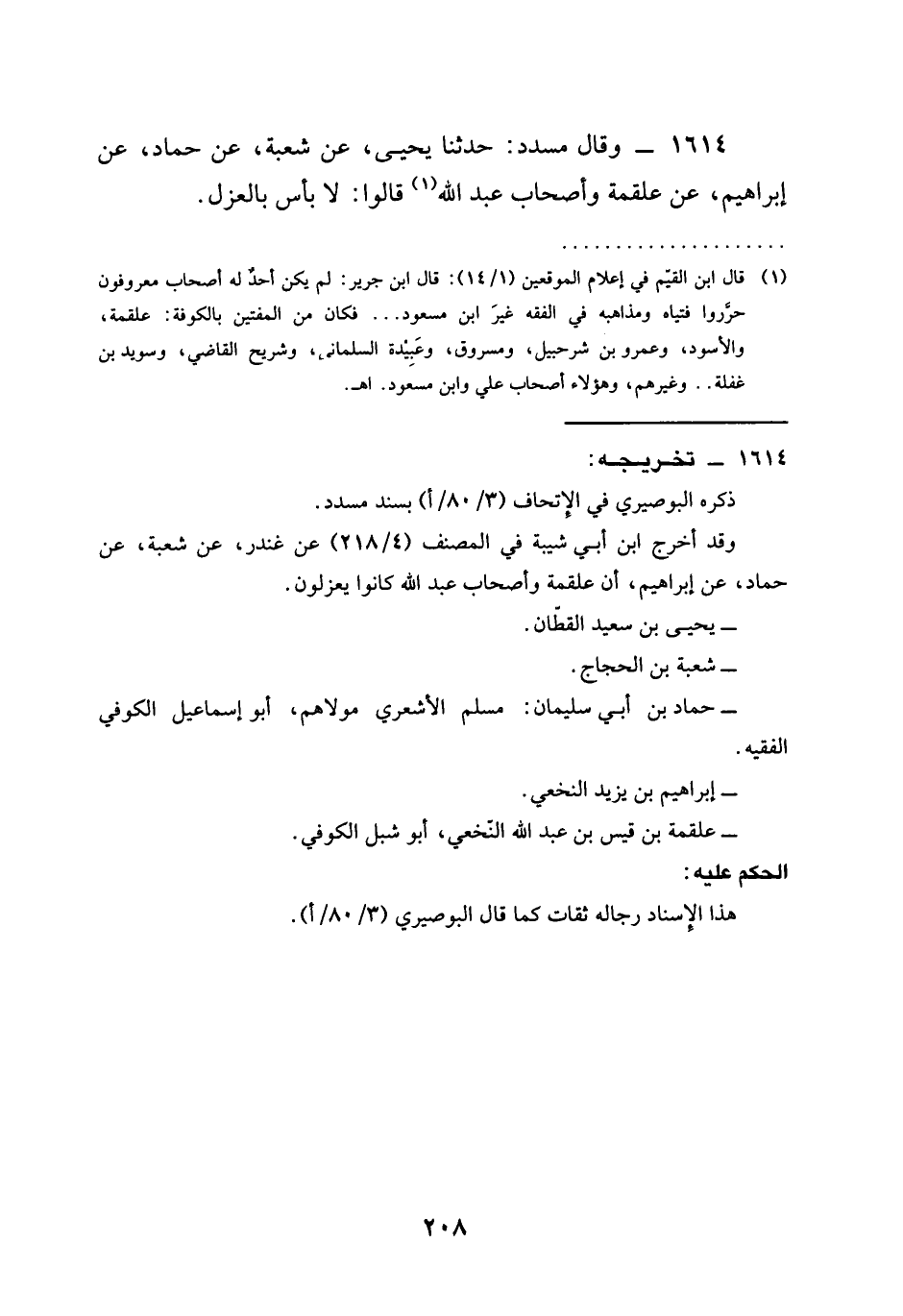 1614 - وَقَالَ مُسَدَّدٌ حَدَّثَنَا يَحْيَى عَنْ شُعْبَةَ عَنْ حَمَّادٍ عَنْ إِبْرَاهِيمَ عَنْ عَلْقَمَةَ وَأَصْحَابِ عَبْدِ اللَّهِ قَالُوا §لَا بَأْسَ بِالْعَزْلِ