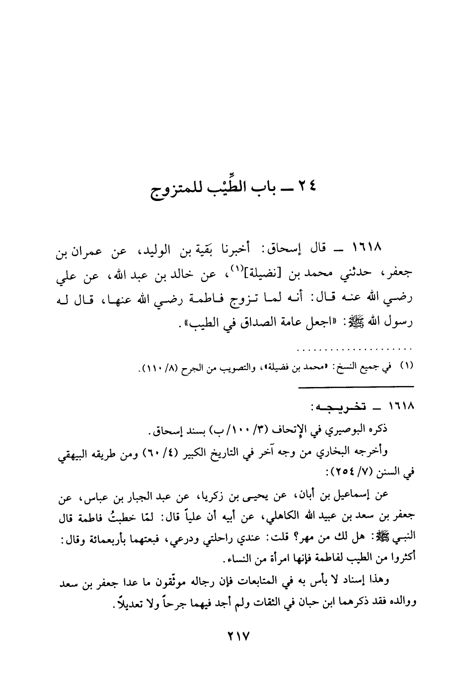 1618 - قَالَ إِسْحَاقُ أَخْبَرَنَا بَقِيَّةُ بْنُ الْوَلِيدِ عَنْ عِمْرَانَ بْنِ جَعْفَرٍ حَدَّثَنِي محمد بن نضيلة عَنْ خَالِدِ بْنِ عَبْدِ اللَّهِ عن على رَضِيَ الله عَنْه قال أَنَّهُ لَمَّا تزوج فاطمة رَضِيَ الله عَنْها قَالَ لَهُ رَسُولُ اللَّهِ صَلَّى اللَّهُ عَلَيْهِ وَسَلَّمَ §اجْعَلْ عَامَّةَ الصَّدَاقِ فِي الطِّيبِ