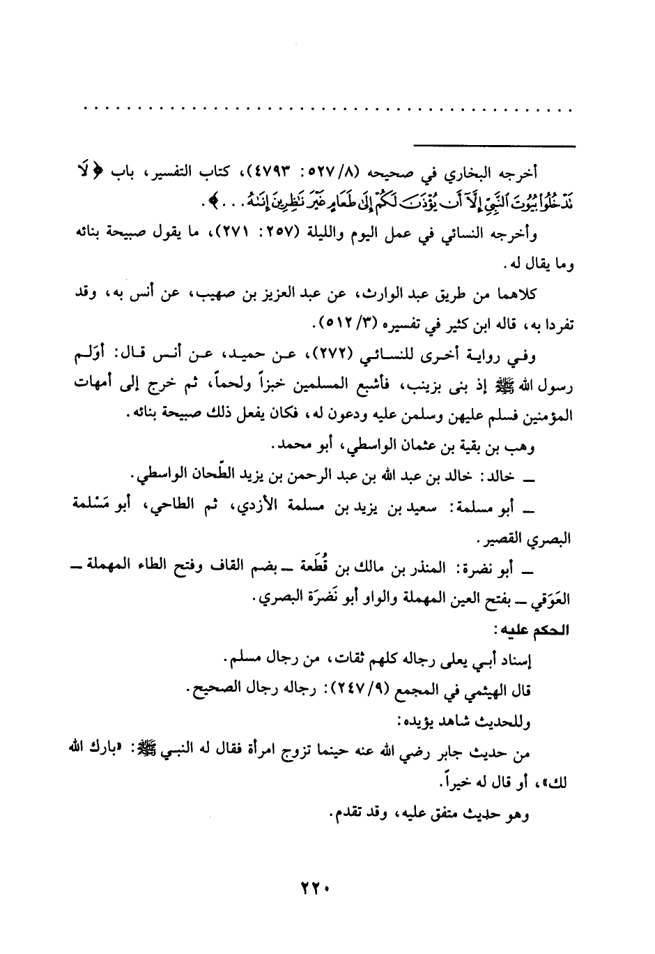 = أخرجه البخاري في صحيحه (8/ 527: 4793)، كتاب التفسير، باب {لَا تَدْخُلُوا بُيُوتَ النَّبِيِّ إِلَّا أَنْ يُؤْذَنَ لَكُمْ إِلَى طَعَامٍ غَيْرَ نَاظِرِينَ إِنَاهُ ...}.