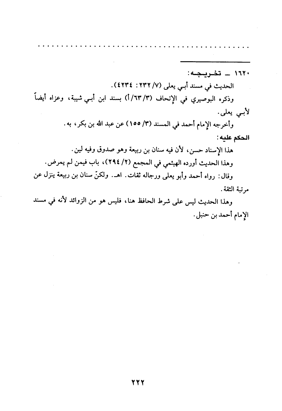 وهذا الحديث ليس على شرط الحافظ هنا، فليس هو من الزوائد لأنه في مسند الإِمام أحمد بن حنبل.