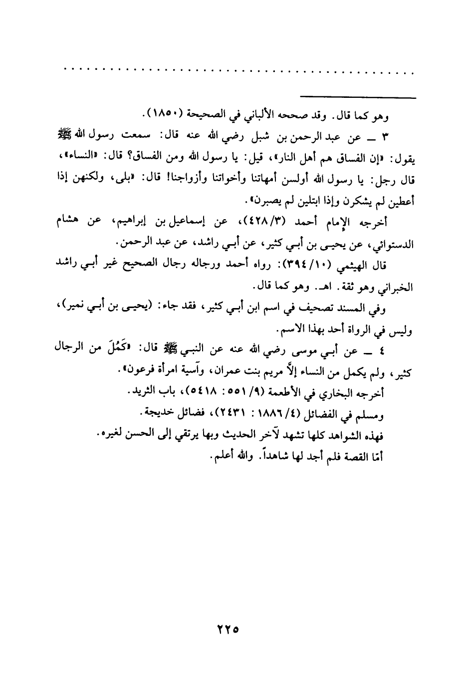 3 - عن عبد الرحمن بن شبل رضي الله عنه قال: سمعت رسول الله -صلى الله عليه وسلم- يقول: "إن الفساق هم أهل النار"، قيل: يا رسول الله ومن الفساق؟ قال:"النساء"، قال رجل: يا رسول الله أولسن أمهاتنا وأخواتنا وأزواجنا! قال: "بلى، ولكنهن إذا أعطين لم يشكرن وإذا ابتلين لم يصبرن".