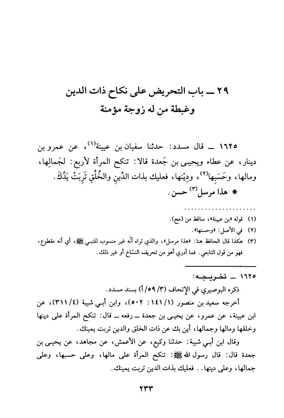 1625 - قَالَ مُسَدَّدٌ حَدَّثَنَا سُفْيَانُ بْنُ عُيَيْنَةَ عَنْ عَمْرِو بْنِ دِينَارٍ عَنْ عَطَاءٍ وَيَحْيَى بْنِ جَعْدَةَ قَالَا §تُنْكَحُ الْمَرْأَةُ لِأَرْبَعٍ لِجَمَالِهَا ومالا وَحَسَبِهَا وَدِينِهَا فَعَلَيْكَ بِذَاتِ الدِّينِ والخلق تربت يدك هَذَا مُرْسَلٌ حَسَنٌ
