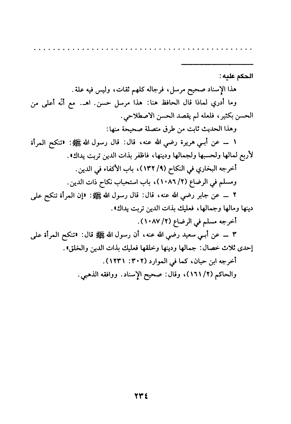 1 - عن أبي هريرة رَضِيَ اللَّهُ عَنْهُ، قَالَ: قَالَ رَسُولُ اللَّهِ -صلى الله عليه وسلم-: "تنكح المرأة لأربع لمالها ولحسبها ولجمالها ودينها، فاظفر بذات الدين تربت يداك".