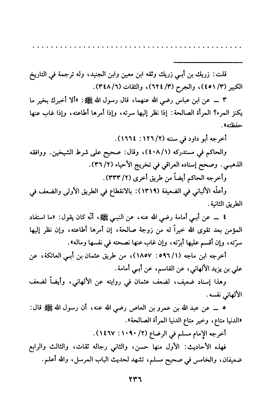 3 - عَنِ ابْنِ عَبَّاسٍ رَضِيَ اللَّهُ عَنْهُمَا، قَالَ رسول الله -صلى الله عليه وسلم-: "إلا أخبرك بخير ما يكنز المرء؟ الْمَرْأَةُ الصَّالِحَةُ: إِذَا نَظَرَ إِلَيْهَا سَرَّتْهُ، وَإِذَا أمرها أطاعته، وإذا غاب عنها حفظته".
