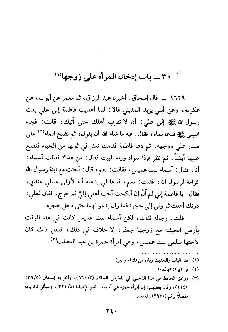 1629 - قَالَ إِسْحَاقُ أَخْبَرَنَا عَبْدُ الرَّزَّاقِ ثنا مَعْمَرٌ عَنْ أَيُّوبَ عَنْ عِكْرِمَةَ وَعَنْ أَبِي يَزِيدَ الْمَدَنِيِّ قَالَا لَمَّا أُهْدِيَتْ فَاطِمَةُ إلى علي بَعَثَ رَسُولُ اللَّهِ صَلَّى اللَّهُ عَلَيْهِ وَسَلَّمَ إِلَى عَلِيٍّ أَنْ §لَا تَقْرَبْ أَهْلَكَ حَتَّى آتيك قالت فجاء النَّبِيُّ صَلَّى اللَّهُ عَلَيْهِ وَسَلَّمَ فَدَعَا بِمَاءٍ فَقَالَ فِيهِ مَا شَاءَ اللَّهُ أَنْ يَقُولَ ثُمَّ نَضَحَ الْمَاءُ عَلَى صَدْرِ عَلِيٍّ وَوَجْهِهِ ثُمَّ دَعَا فَاطِمَةَ فَقَامَتْ تَعْثُرُ فِي ثَوْبِهَا مِنَ الْحَيَاءِ فنضح عَلَيْهَا أَيْضًا ثُمَّ نظر فإذا سوداء وَرَاءَ الْبَيْتِ فَقَالَ مَنْ هَذَا فَقَالَتْ أَسْمَاءُ أَنَا فَقَالَ أَسْمَاءُ بِنْتُ عُمَيْسٍ فقالت نعم قال أجئت مَعَ ابْنَةِ رَسُولِ اللَّهِ كَرَامَةً لِرَسُولِ اللَّهِ فَقُلْتُ نعم فدعا في بِدُعَاءٍ إِنَّهُ لَأَوْلَى عَمَلِي عِنْدِي فَقَالَ يَا فَاطِمَةُ إِنِّي لَمْ آلُ أَنْ أَنْكَحْتُ أَحَبَّ أَهْلِي إِلَيَّ ثُمَّ خرج فقال العلي دُونَكَ أَهْلَكَ ثُمَّ وَلَّى إِلَى حُجْرَةٍ فَمَا زَالَ يَدْعُو لهما حتى دجل حُجْرَةً قُلْتُ رِجَالُهُ ثِقَاتٌ لَكِنَّ أَسْمَاءَ بِنْتَ عُمَيْسٍ كَانَتْ فِي هَذَا الْوَقْتِ بِأَرْضِ الْحَبَشَةِ مَعَ زَوْجِهَا جَعْفَرٍ لَا خِلَافَ فِي ذَلِكَ فَلَعَلَّ ذَلِكَ كَانَ لِأُخْتِهَا سَلْمَى بِنْتِ عُمَيْسٍ وَهِيَ امْرَأَةُ حَمْزَةَ بْنِ عَبْدِ الْمُطَّلِبِ