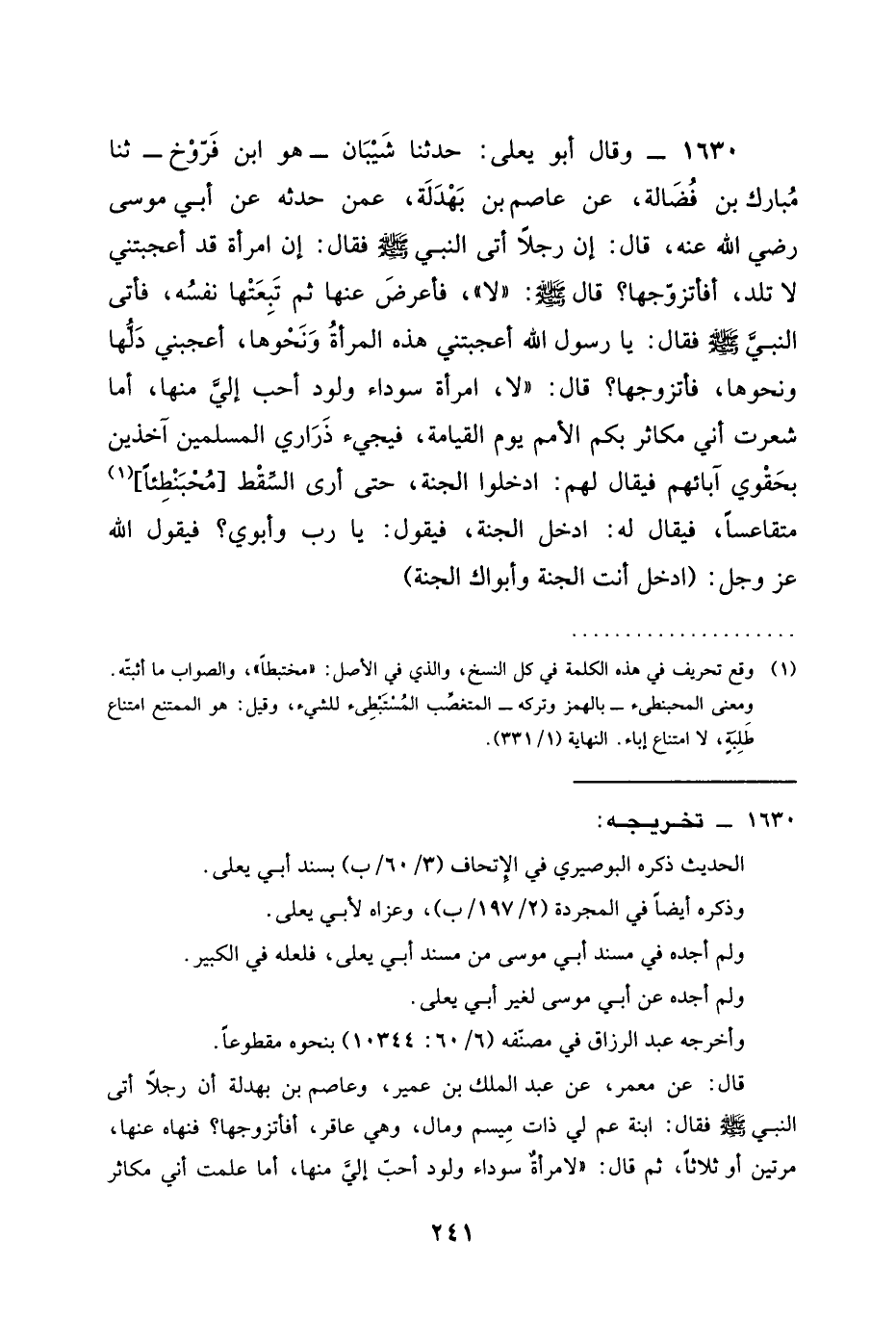 1630 - وَقَالَ أَبُو يَعْلَى حَدَّثَنَا شَيْبَانُ هو ابن فروح ثنا مُبَارَكُ بْنُ فَضَالَةَ عَنْ عَاصِمِ بن بهدلة عمن حَدَّثَهُ عَنْ أبي موسى رَضِيَ الله عَنْه قال أَنَّ رَجُلًا أَتَى النَّبِيَّ صَلَّى اللَّهُ عَلَيْهِ وَسَلَّمَ فَقَالَ إن امرأة قد أَعْجَبَتْنِي لَا تَلِدُ أفأتزوجها قَالَ صَلَّى اللَّهُ عَلَيْهِ وَسَلَّمَ لَا فَأَعْرَضَ عَنْهَا ثُمَّ تبعتها نَفْسُهُ فَأَتَى النَّبِيَّ صَلَّى اللَّهُ عَلَيْهِ وَسَلَّمَ فَقَالَ يَا رَسُولَ اللَّهِ أَعْجَبَتْنِي هَذِهِ الْمَرْأَةُ وَنَحْوُهَا أَعْجَبَنِي دَلُّهَا وَنَحْوُهَا فأتزوجها قال §لامرأة سَوْدَاءُ وَلُودٌ أَحَبُّ إِلَيَّ مِنْهَا أَمَا شَعَرْتَ أَنِّي مُكَاثِرٌ بِكُمُ الْأُمَمَ يَوْمَ الْقِيَامَةِ فَيَجِيءُ ذَرَارِيُّ الْمُسْلِمِينَ آخِذِينَ بِحَقْوَيْ آبَائِهِمْ فَيُقَالُ لَهُمُ ادْخُلُوا الْجَنَّةَ حَتَّى أَرَى السَّقْطَ مُحْبَنْطِئًا مُتَقَاعِسًا فَيُقَالُ لَهُ ادْخُلِ الْجَنَّةَ فَيَقُولُ يَا رَبِّ وأبوي فَيَقُولُ اللَّهُ عَزَّ وَجَلَّ ادخل أنت الجنة وأبوك الجنة