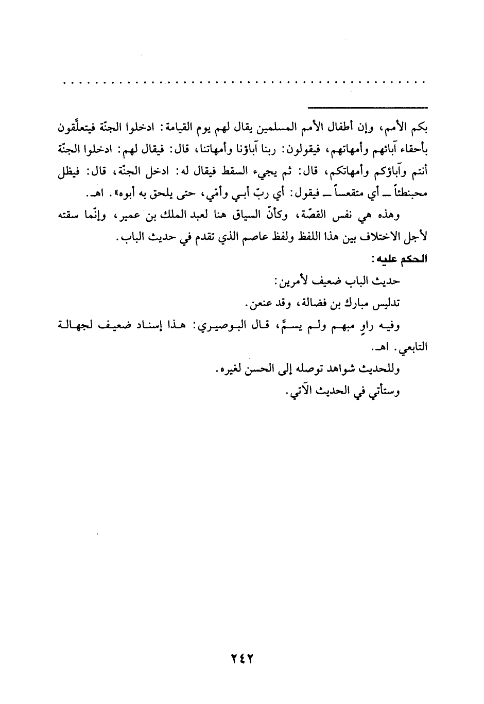 = بكم الأمم، وإن أطفال الأمم المسلمين يقال لهم يوم القيامة: ادخلوا الجنة فيتعلَّقون بأحقاء آبائهم وأمهاتهم، فيقولون: ربنا آباؤنا وأمهاتنا، قال: فيقال لهم: ادخلوا الجنة أنتم وآباؤكم وأمهاتكم، قال: ثم يجيء السقط فيقال له: ادخل الجنة، قال: فيظل محبنطئًا -أي متقعسًا- فيقول: أي ربّ أبي وأمي حتى يلحق به أبوه ". اهـ.
