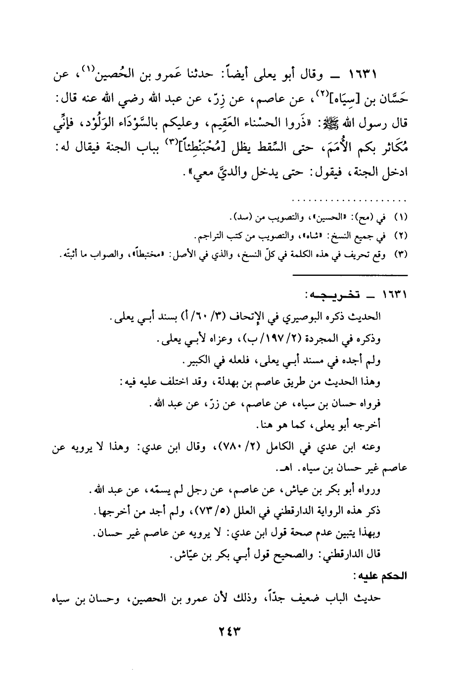 1631 - وَقَالَ أبو يعلى أيضا حَدَّثَنَا عَمْرُو بْنُ الحصين عن حَسَّانُ بْنُ سِيَاهْ عَنْ عَاصِمٍ عَنْ زِرٍّ عَنْ عبد الله رَضِيَ الله عَنْه قَالَ قَالَ رَسُولُ اللَّهِ صَلَّى اللَّهُ عَلَيْهِ وَسَلَّمَ §ذَرُوا الْحَسْنَاءَ الْعَقِيمَ وَعَلَيْكُمْ بِالسَّوْدَاءِ الْوَلُودِ فَإِنِّي مكاثر بكم الأمم حَتَّى السَّقْطُ يَظَلُّ مُحْبَنْطِئًا بِبَابِ الْجَنَّةِ فَيُقَالُ لَهُ ادْخُلِ الْجَنَّةَ فَيَقُولُ حَتَّى يَدْخُلَ والدي مَعِي