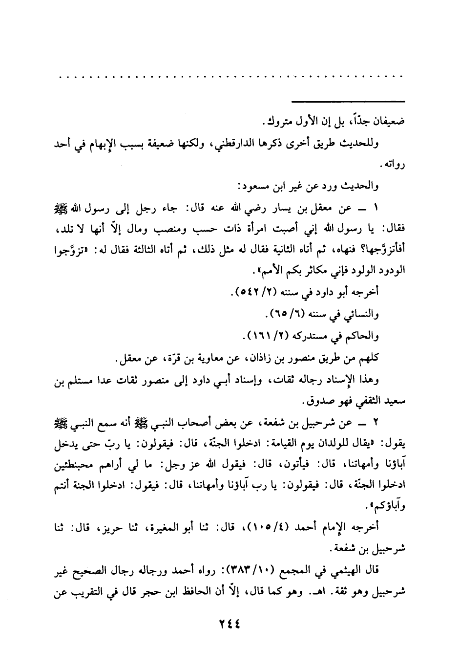 2 - عن شرحبيل بن شفعة، عَنْ بَعْضِ أَصْحَابِ النَّبِيِّ -صَلَّى اللَّهُ عَلَيْهِ وَسَلَّمَ- أَنَّهُ سَمِعَ النَّبِيَّ -صَلَّى اللَّهُ عَلَيْهِ وَسَلَّمَ- يقول: "يقال للولدان يوم القيامة: ادخلوا الجنّة، قال: فيقولون: يا ربّ حتى يدخل آباؤنا وأمهاتنا، قال: فيأتون، قال: فيقول الله عز وجل: ما لي أراهم محبنطئين ادخلوا الجنّة، قال: فيقولون: يا رب آباؤنا وأمهاتنا، قال: فيقول: ادخلوا الجنة أنتم وآباؤكم".