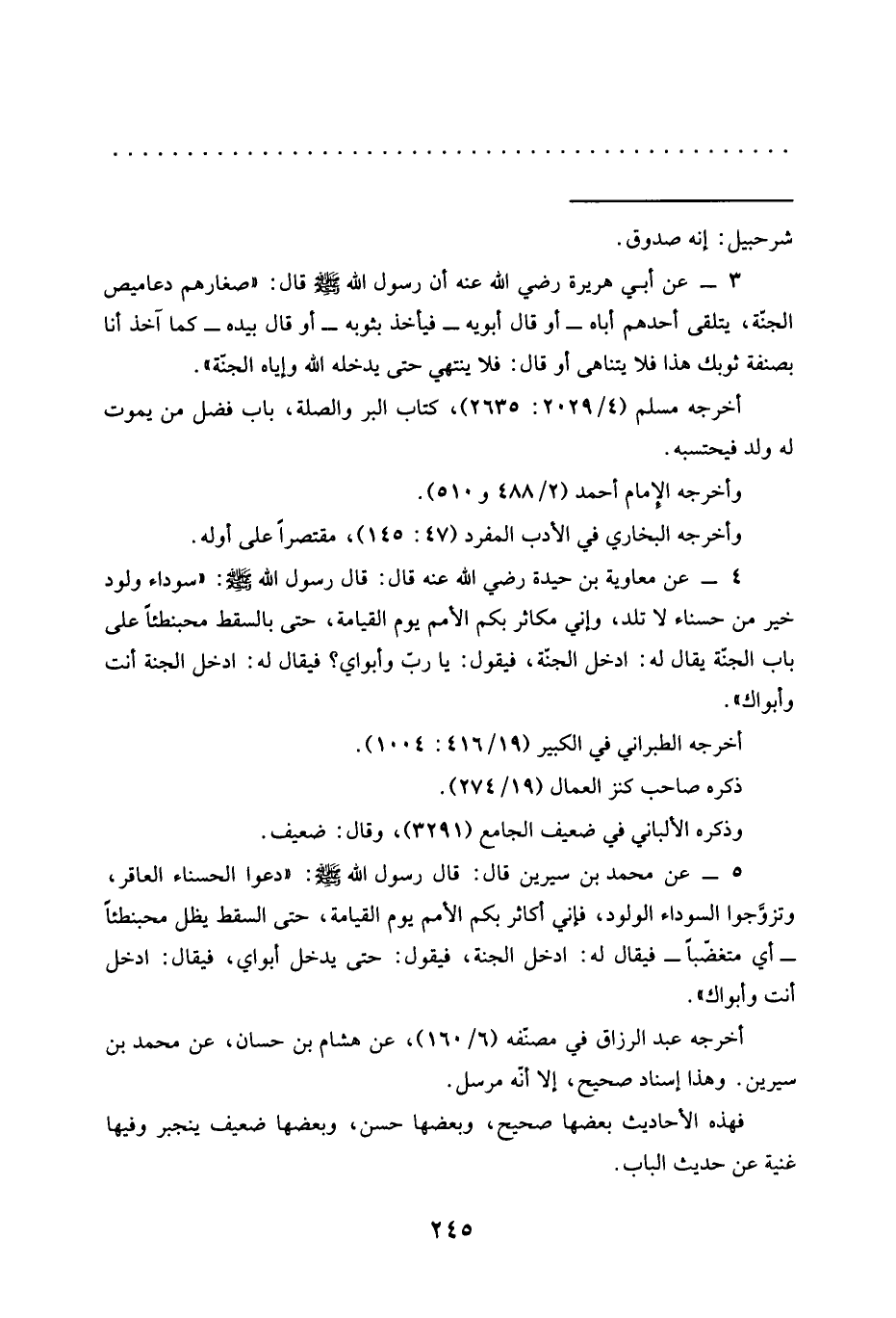 5 - عن محمد بن سيرين قَالَ: قَالَ رَسُولُ اللَّهِ -صَلَّى اللَّهُ عَلَيْهِ وسلم-: "دعوا الحسناء العاقر، وتزوَّجوا السوداء الولود، فإني أكاثر بكم الأمم يوم القيامة، حتى السقط يظل محبنطئًا -أي متغضّبًا- فَيُقَالُ لَهُ: ادْخُلِ الْجَنَّةَ، فَيَقُولُ: حَتَّى يَدْخُلَ أبواي، فيقال: ادخل أنت وأبواك".