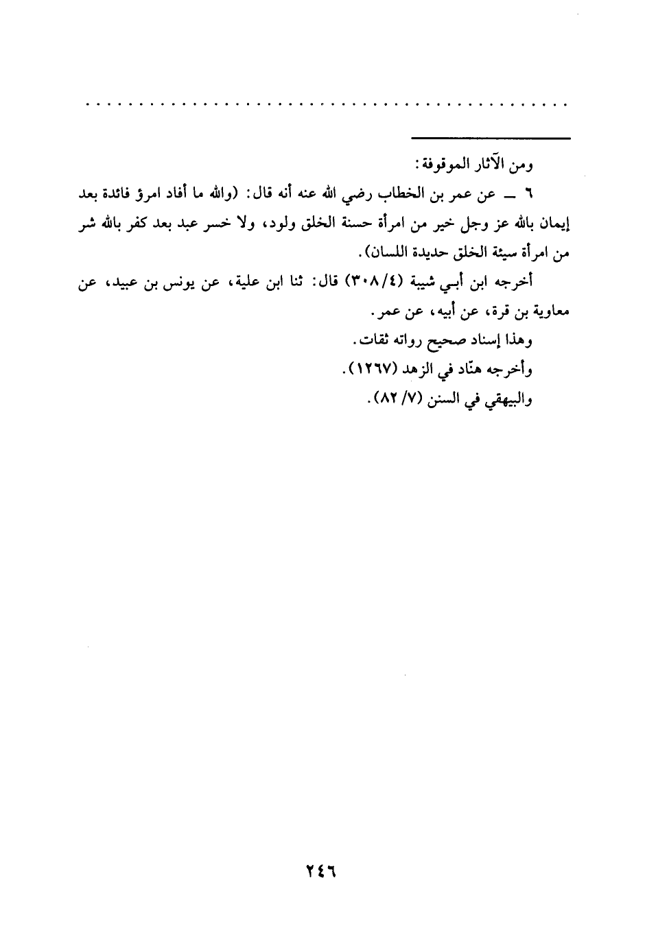 6 - عن عمر بن الخطاب رضي الله عنه أنه قال: (والله ما أفاد امرؤ فائدة بعد إيمان بالله عَزَّ وَجَلَّ خير من امرأة حسنة الخلق ولود، ولا خسر عبد بعد كفر بالله شر من امرأة سيئة الخلق حديدة اللسان).
