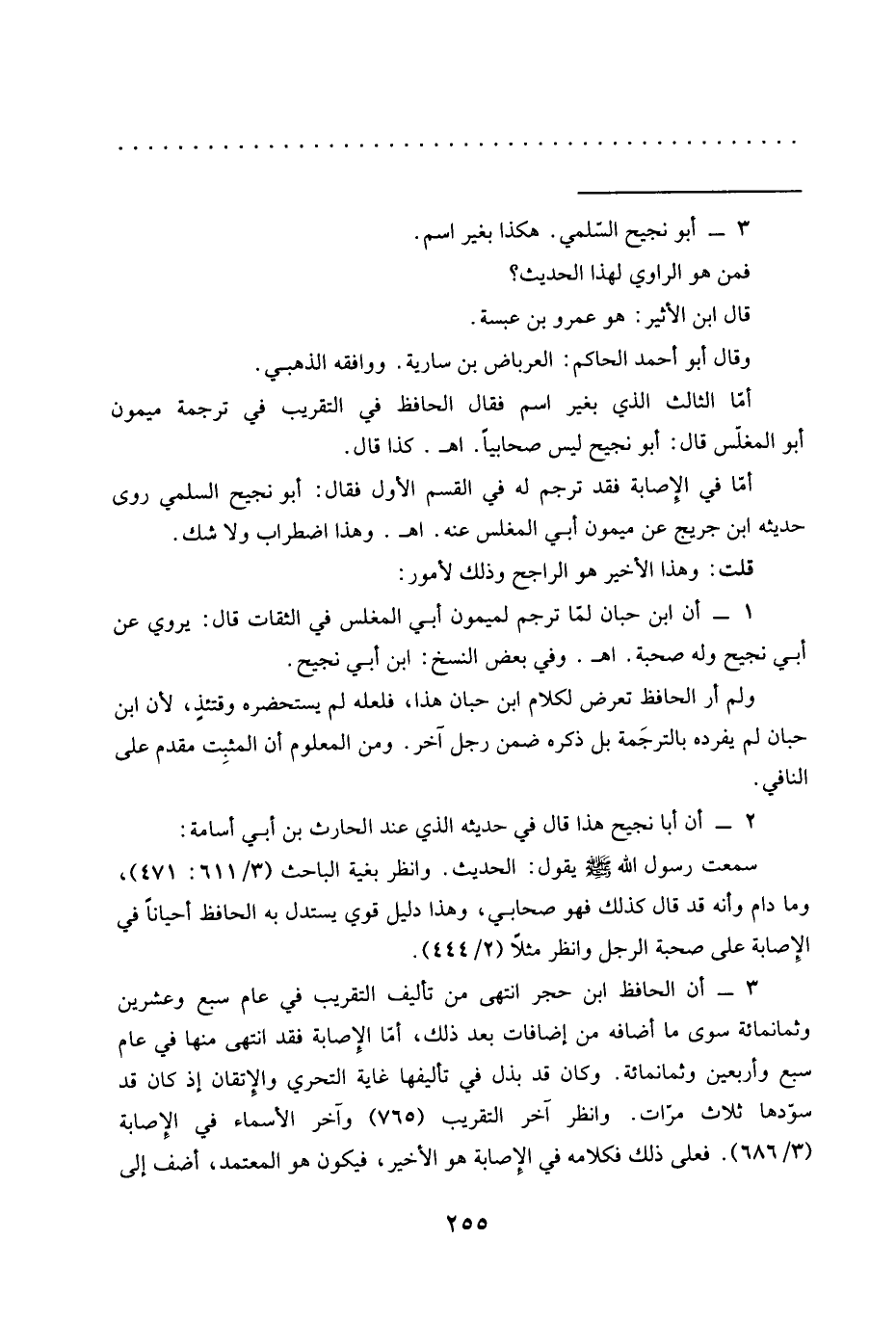 2 - أن أبا نجيح هذا قال في حديثه الذي عند الحارث بن أبي أسامة: سمعت رسول الله -صلى الله عليه وسلم- يقول: الحديث. وانظر بغية الباحث (3/ 611: 471)، وما دام وأنه قد قال كذلك فهو صحابي، وهذا دليل قوي يستدل به الحافظ أحيانًا في الإِصابة على صحبة الرجل وانظر مثلًا (2/ 444).