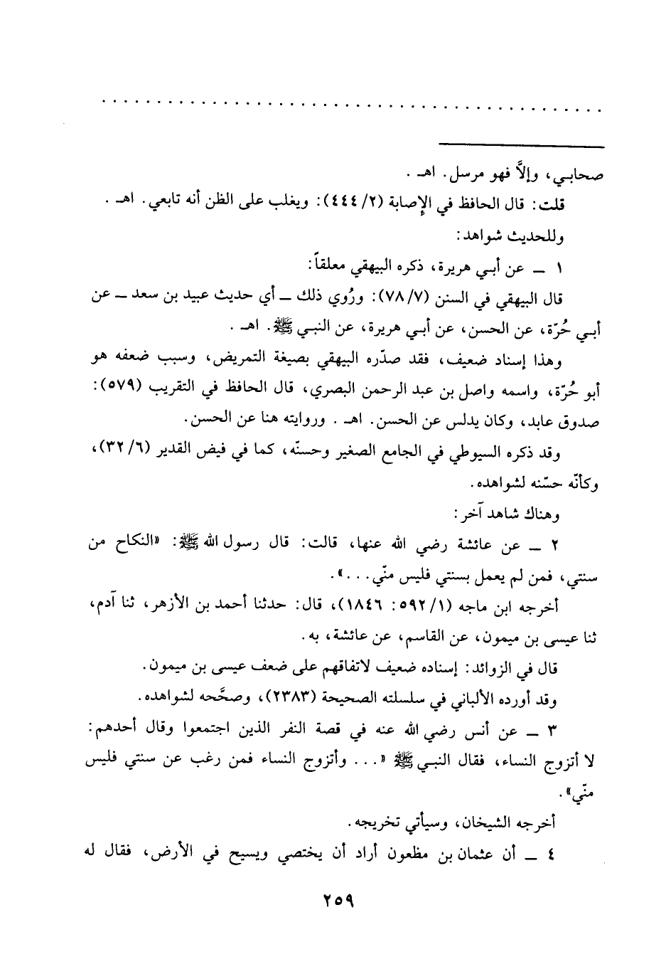2 - عن عائشة رضي الله عنها، قَالَتْ: قَالَ رَسُولُ اللَّهِ -صَلَّى اللَّهُ عَلَيْهِ وسلم-: "النكاح من سنتي، فمن لم يعمل بسنتي فليس منّي ... ".