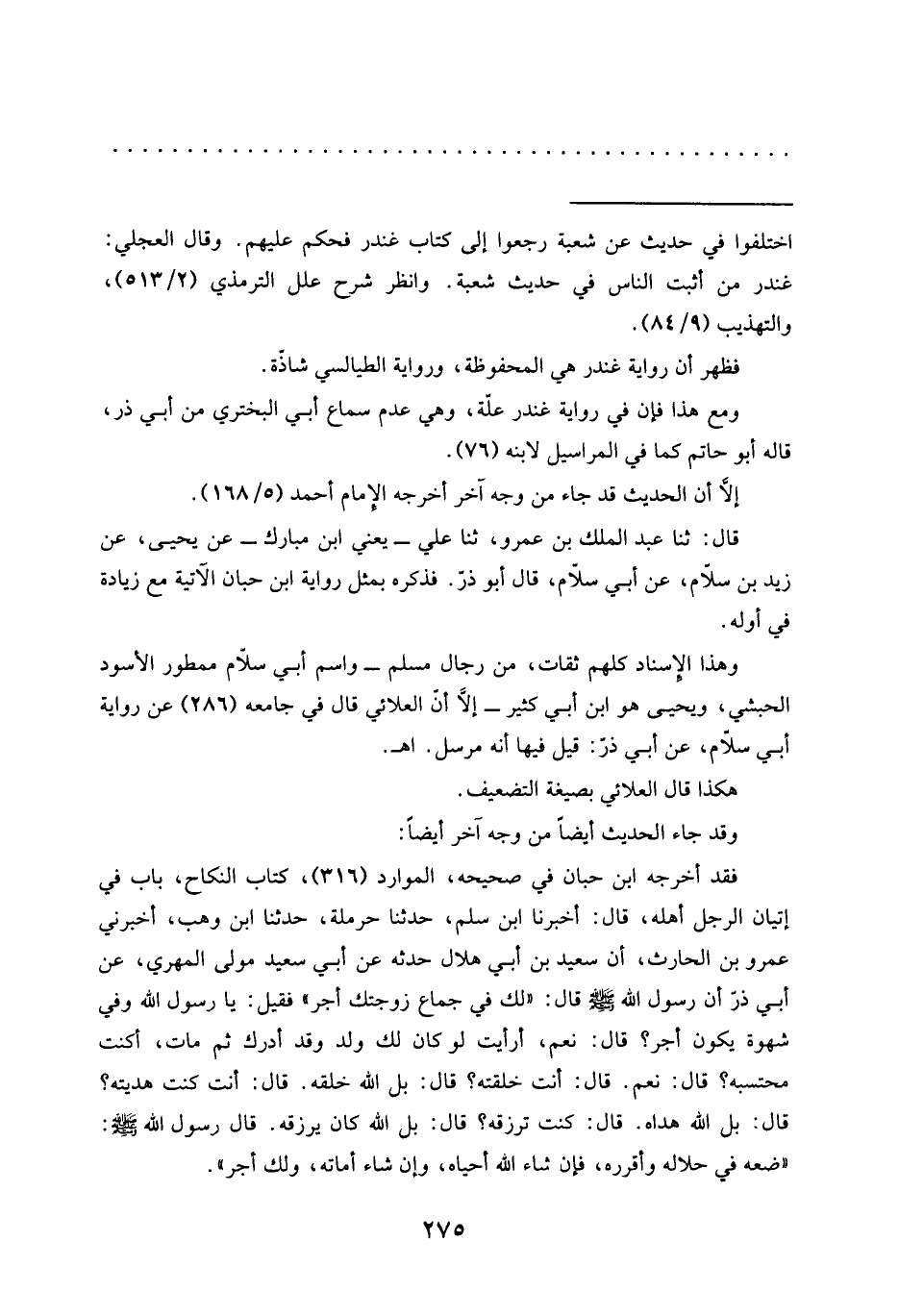 ومع هذا فإن في رواية غندر علّة، وهي عدم سماع أبي البختري من أبي ذر، قاله أبو حاتم كما في المراسيل لابنه (76).