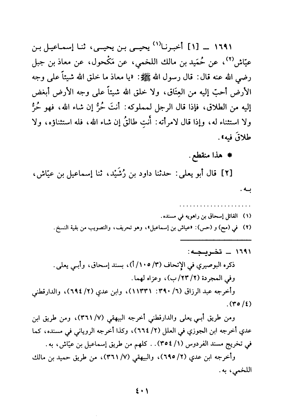 1691 - أَخْبَرَنَا يَحْيَى بْنُ يَحْيَى ثنا إِسْمَاعِيلُ بْنُ عَيَّاشٍ عَنْ حُمَيْدِ بْنِ مَالِكٍ اللَّخْمِيِّ عَنْ مَكْحُولٍ عَنْ مُعَاذِ بن جبل رَضِيَ الله عَنْه قَالَ قَالَ رَسُولُ اللَّهِ صَلَّى اللَّهُ عَلَيْهِ وَسَلَّمَ يَا مُعَاذُ §مَا خَلَقَ اللَّهُ شَيْئًا عَلَى وَجْهِ الْأَرْضِ أَحَبَّ إِلَيْهِ مِنَ الْعِتَاقِ وَلَا خلق الله شَيْئًا عَلَى وَجْهِ الْأَرْضِ أَبْغَضَ مِنَ الطَّلَاقِ فَإِذَا قَالَ الرَّجُلُ لِمَمْلُوكِهِ أَنْتَ حُرٌّ إِنْ شَاءَ اللَّهُ فَهُوَ حُرٌّ وَلَا اسْتِثْنَاءَ لَهُ وَإِذَا قَالَ لِامْرَأَتِهِ أَنْتِ طَالِقٌ إِنْ شَاءَ اللَّهُ فَلَهُ اسْتِثْنَاؤُهُ وَلَا طَلَاقَ فِيهِ