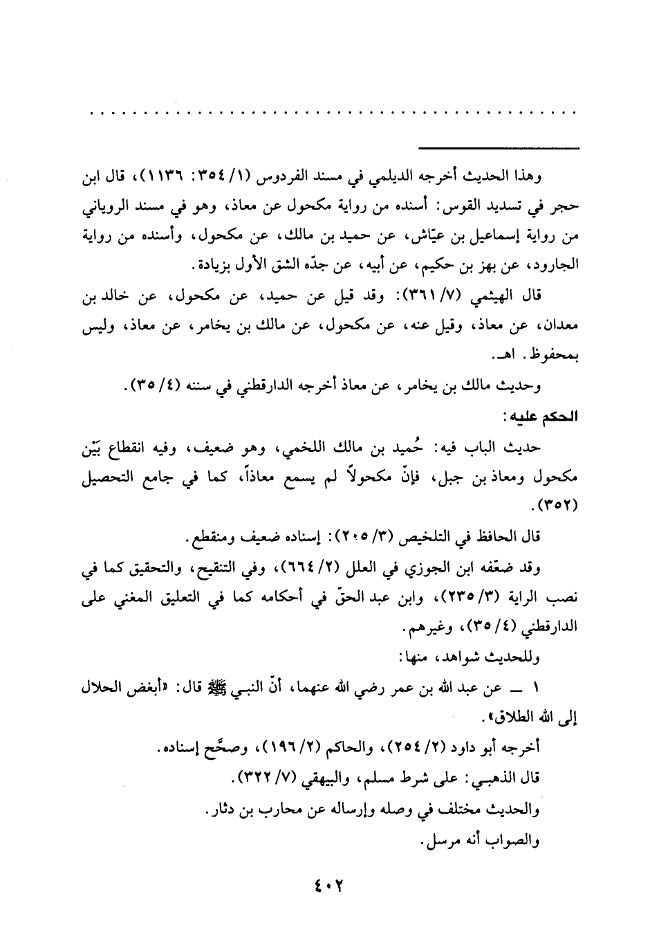 1 - عن عبد الله بن عمر رضي الله عنهما، أن النبي -صلى الله عليه وسلم- قال: "أبغض الحلال إلى الله الطلاق".