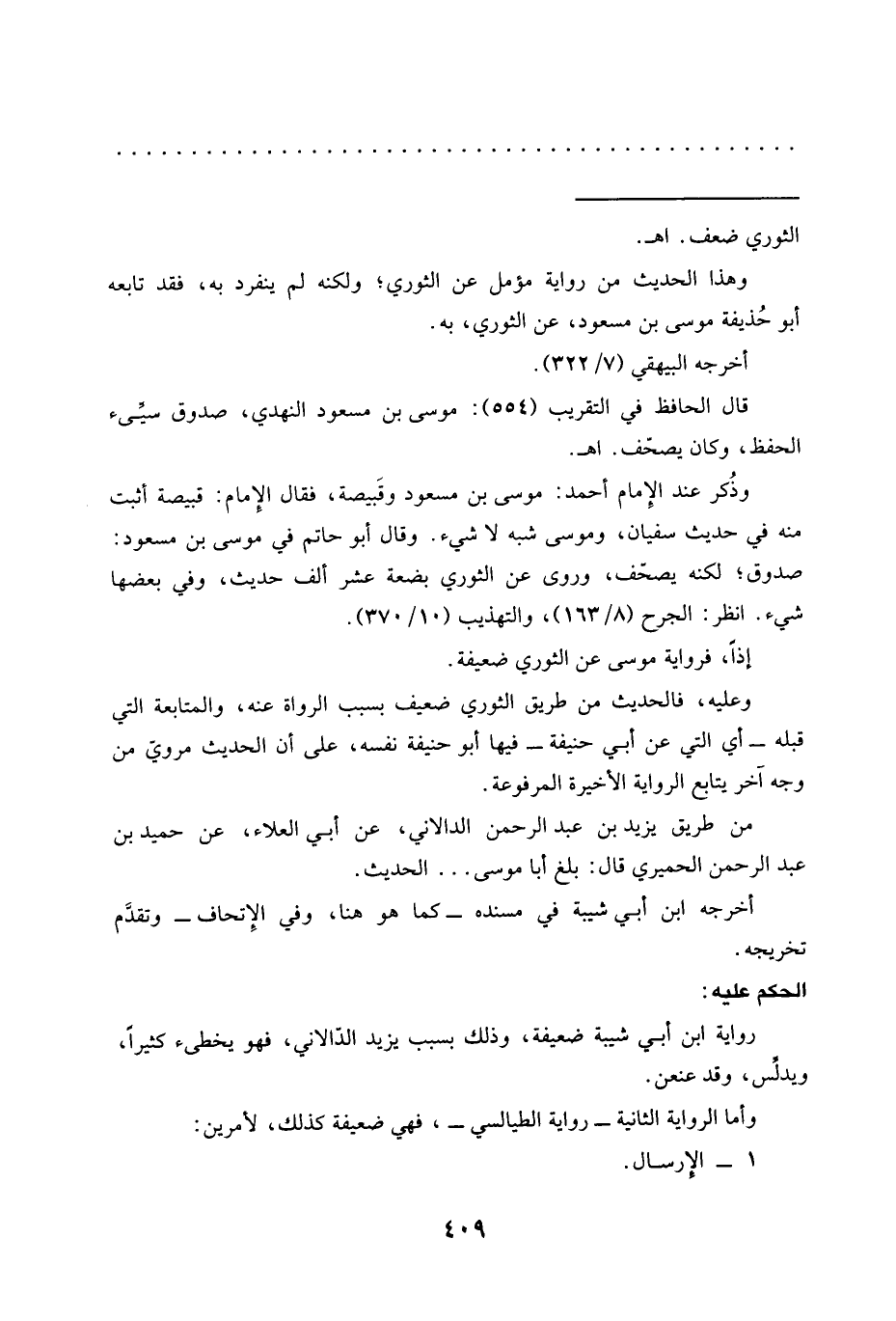 وعليه، فالحديث من طريق الثوري ضعيف بسبب الرواة عنه، والمتابعة التي قبله -أي التي عن أبي حنيفة- فيها أبو حنيفة نفسه، على أن الحديث مرويّ من وجه آخر يتابع الرواية الأخيرة المرفوعة.