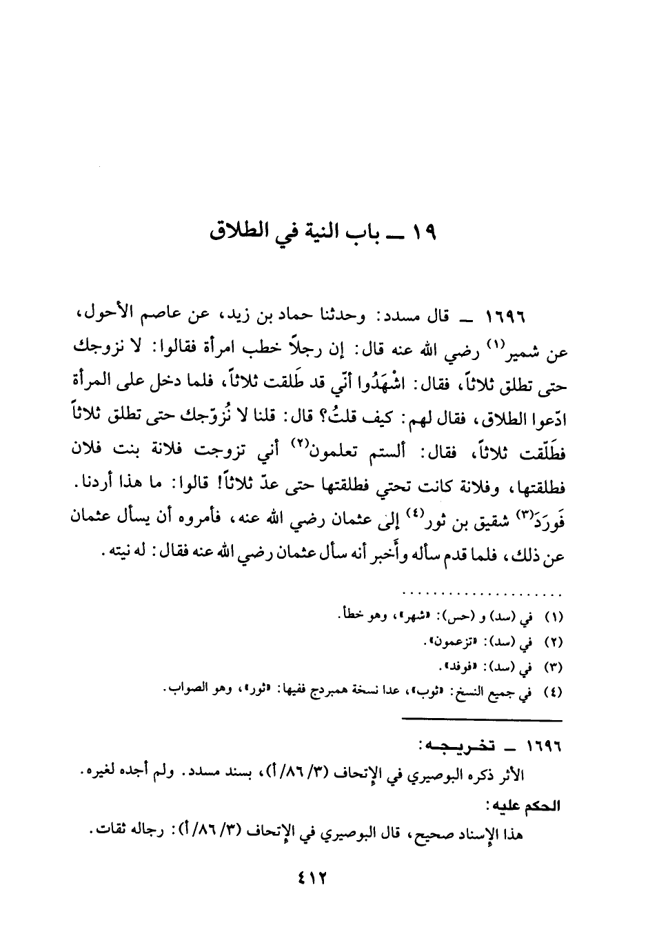 1696 - قَالَ مُسَدَّدٌ وحدثنا حَمَّادُ بْنُ زَيْدٍ عَنْ عَاصِمٍ الأحول عن شمير رَضِيَ الله عَنْه قال أَنَّ رَجُلًا خَطَبَ امْرَأَةً فَقَالُوا §لَا نُزَوِّجُكَ حَتَّى تُطَلِّقَ ثَلَاثًا فَقَالَ اشهدوا اني قد طَلَّقْتُ ثَلَاثًا فَلَمَّا دَخَلَ عَلَى الْمَرْأَةِ ادَّعَوُا الطَّلَاقَ فَقَالَ لَهُمْ كَيْفَ قُلْتُ قَالَ قُلْنَا لَا نُزَوِّجُكَ حَتَّى تُطَلِّقَ ثَلَاثًا فَطَلَّقْتَ ثَلَاثًا فَقَالَ ألستم تعلمون أن تَزَوَّجْتُ فُلَانَةَ بِنْتَ فُلَانٍ فَطَلَّقْتُهَا وَفُلَانَةُ كَانَتْ تَحْتِي فَطَلَّقْتُهَا حَتَّى عَدَّ ثَلَاثًا قَالُوا مَا هذا أردنا فورد شَقِيقُ بْنُ ثَوْرٍ إلى عثمان رَضِيَ الله عَنْه فَأَمَرُوهُ أَنْ يَسْأَلَ عُثْمَانَ عَنْ ذَلِكَ فَلَمَّا قَدِمَ سَأَلَهُ واخبر أَنَّهُ سال عثمان رَضِيَ الله عَنْه فَقَالَ لَهُ نِيَّتُهُ