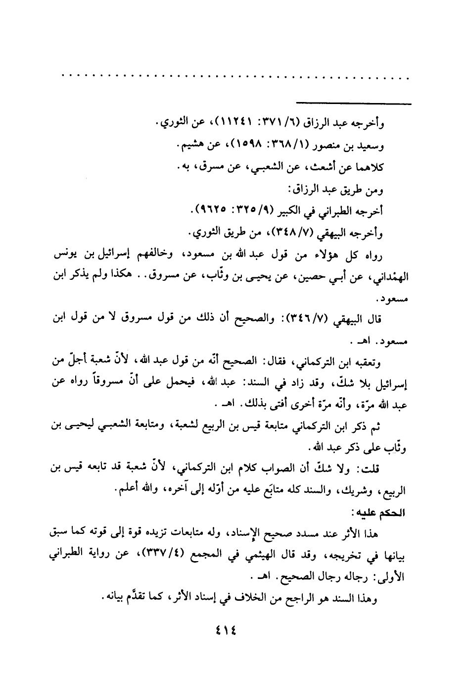 وتعقبه ابن التركماني، فقال: الصحيح أنه من قول عبد الله , لأنّ شعبة أجلّ من إسرائيل بلا شكّ، وقد زاد في السند: عبد الله، فيحمل على أنّ مسروقًا رواه عن عبد الله مرة، وأنه مرّة أخرى أفتى بذلك. اهـ.