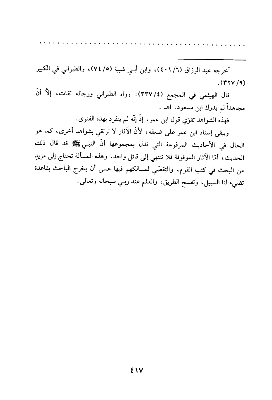 ويبقى إسناد ابن عمر على ضعفه , لأن الآثار لا ترتقي بشواهد أخرى، كما هو الحال في الأحاديث المرفوعة التي تدل بمجموعها أن النبي -صلى الله عليه وسلم- قد قال ذلك الحديث، أمّا الآثار الموقوفة فلا تنتهي إلى قائل واحد، وهذه المسألة تحتاج إلى مزيد من البحث في كتب القوم، والتقصّي لمسالكهم فيها عسى أن يخرج الباحث بقاعدة تضيء لنا السبيل، وتفسح الطريق، والعلم عند ربي سبحانه وتعالى.