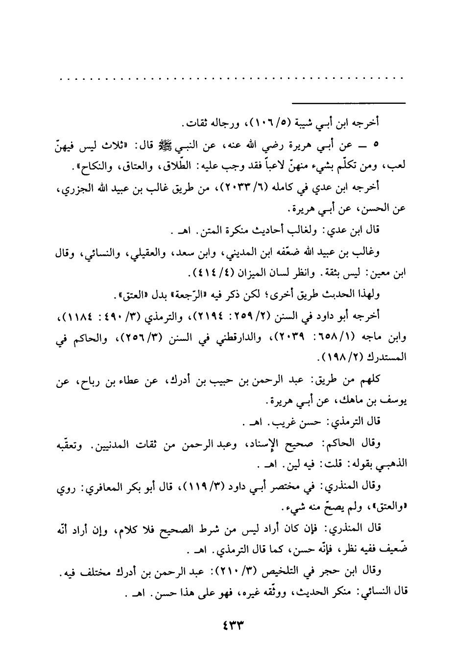 5 - عَنْ أَبِي هُرَيْرَةَ رَضِيَ اللَّهُ عَنْهُ، عَنِ النَّبِيِّ -صَلَّى اللَّهُ عَلَيْهِ وَسَلَّمَ- قَالَ: "ثَلَاثٌ ليس فيهن لعب، ومن تكلّم بشيء منهنّ لاعبًا فقد وجب عليه: الطلاق، والعتاق، والنكاح".