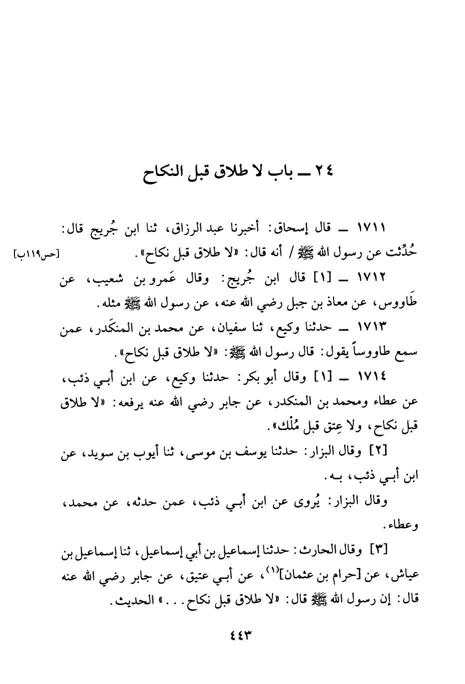 وَقَالَ الْحَارِثُ حَدَّثَنَا إِسْمَاعِيلُ بْنُ أَبِي إِسْمَاعِيلَ ثنا إِسْمَاعِيلُ بْنُ عياش عن حرام بن عُثْمَانَ عَنْ أَبِي عَتِيقٍ عن جابر رَضِيَ الله عَنْه قال أَنَّ رَسُولَ اللَّهِ صَلَّى اللَّهُ عَلَيْهِ وَسَلَّمَ قَالَ §لَا طَلَاقَ قَبْلَ نِكَاحٍ ... الْحَدِيثَ
