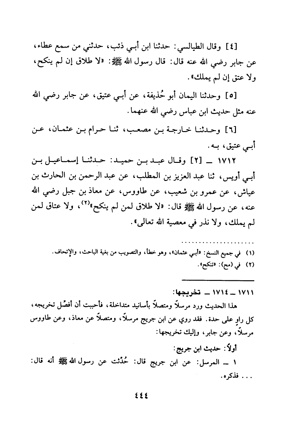 1712 - وَقَالَ عَبْدُ بْنُ حُمَيْدٍ حدثنا إِسْمَاعِيلُ بْنُ أَبِي أُوَيْسٍ ثنا عَبْدُ الْعَزِيزِ بْنُ الْمُطَّلِبِ عَنْ عَبْدِ الرَّحْمَنِ بْنِ الْحَارِثِ بْنِ عَيَّاشٍ عَنْ عَمْرِو بْنِ شُعَيْبٍ عَنْ طاووس عَنْ مُعَاذِ بن جبل رَضِيَ الله عَنْه عَنْ رَسُولِ اللَّهِ صَلَّى اللَّهُ عَلَيْهِ وَسَلَّمَ قَالَ §لَا طَلَاقَ لِمَنْ لَمْ يَنْكِحْ وَلَا عِتَاقَ لِمَنْ لَمْ يَمْلِكْ وَلَا نَذْرَ فِي معصية الله تعالى